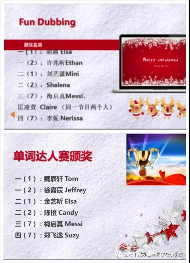 金苹果传统的单词达人赛Vocabulary Talent、最佳英语趣配音奖Outstanding English Dubbing Award、圣诞创意手工作品奖,满满的骄傲和自豪。