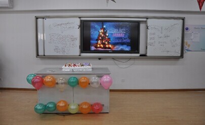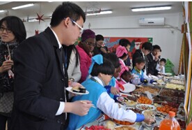 在我们精心装扮过的充满圣诞气息的教室里,板报上那憨态可掬的圣诞老人,窗户玻璃上各种圣诞贴花,挂满各种漂亮挂饰和彩灯的圣诞树……浓浓的节日气氛迎面扑来。12月24日中午时分,伴着欢快的圣诞音乐,家长们陆续到来。他们从家里带来了自己国家的传统美食,有韩国的紫菜包饭、泡菜饼,巴西的牛肉饭,科威特的巧克力饼干,尼日利亚的熏鱼等等。连同学校食堂为我们准备的食品,都被整齐地摆在靠窗的墙边,香味充斥了整个教室。引得好多同学都忍不住走上前趁没人注意,偷偷尝一口。家长纷纷落座以后,孩子们被安排在自己家人的旁边。此时,我们惊奇地发现平时表现调皮的孩子在他们妈妈的身边,却变得十分乖巧呢。家长与孩子、老师们在教室里愉快地互动着,沟通孩子们平时成长中的问题。