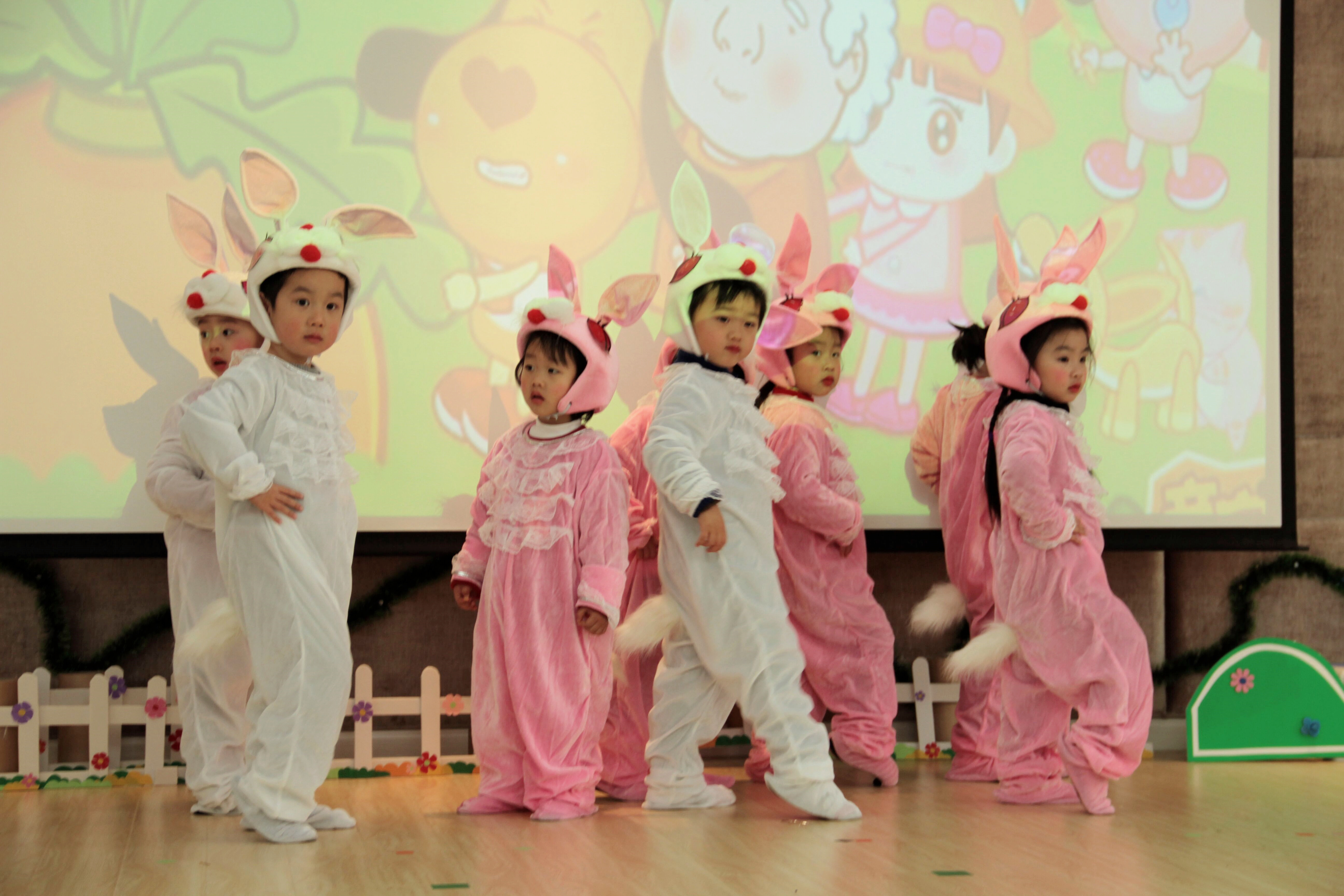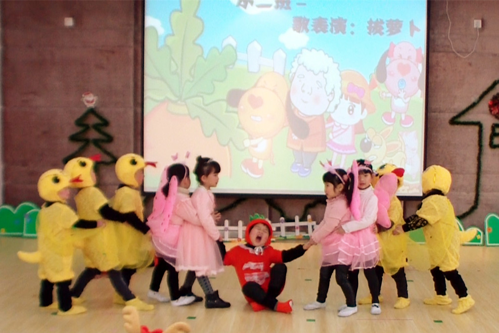 听,中班的孩子们以优雅的姿态,演绎了一首旋律悠扬、歌词柔美的"雪绒花",传达出我们对美好生活的向往、对家乡的无限热爱,以及对人们的真诚的祝福。 小一班的孩子们变身为可爱的、萌萌的小兔子啦!猜猜看,当可怕的大灰狼前来敲门时,会发生什么事情呢? 你听过将著名的童话故事"拔萝卜"改编成了英语歌曲串烧的情境表演吗?小二班的孩子们就在舞台上为大家呈现了一幕富有创意的情景!