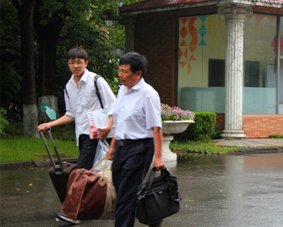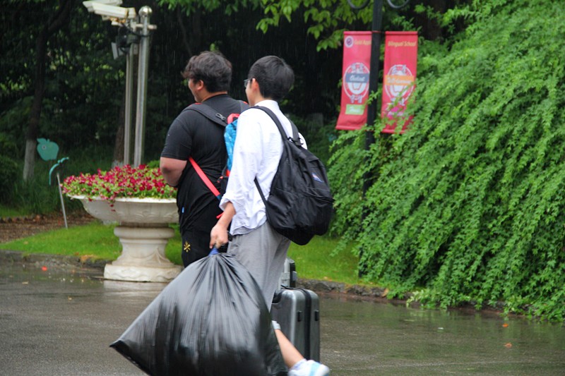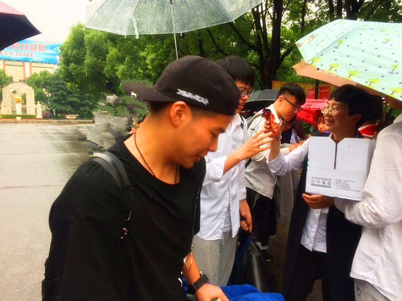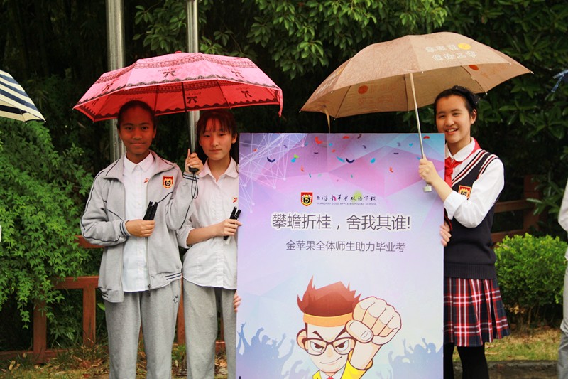 虽然是第八节课时间,虽然此时下着中雨,但是不少同学仍然请假,来为高三的学长学姐们送行。