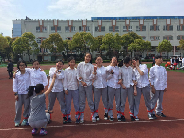第五组出发的初一2班TOP team就没这么顺利了,虽然出发时检查了绑带情况,但走到一半时绑带居然脱落了,重新系紧绑带费时巨大,成绩一下子就落了下来。不过TOP team的队员们并不气馁,他们还会在其他活动中将冠军抢回来的!