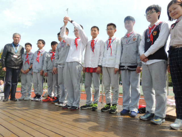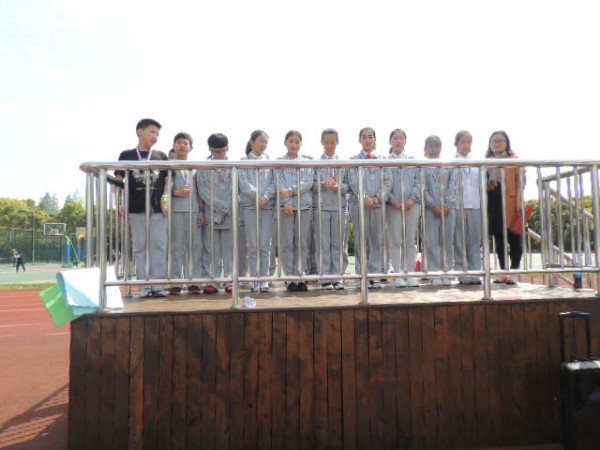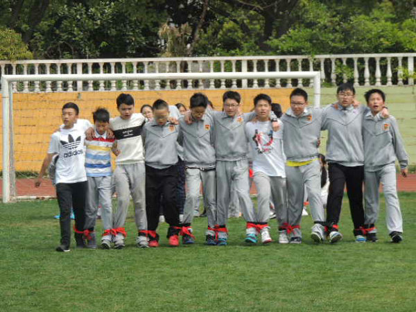 初一剑桥班的Super hamburger队顶住压力,随后也开始了他们的比赛。没想到不给力的绑腿带出现了本场第二次脱落,拖下了前行的进度,成绩远远落后。但这并不影响孩子们的热情,因为前一队“团结就是力量”的响亮歌声还在每一位在场人员的心中回荡。