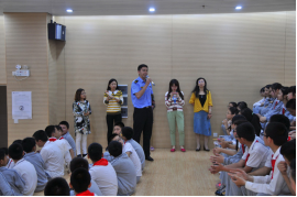 6月7日,中国海监第五支队的7名青年志愿者走进上海市金苹果双语学校国际部,为150余名初中预备年级的孩子们带去了一堂生动而有意义的东海维权形势政治课,校党委书记朱军听课,并为授课海监队员颁发“校外辅导员”的聘书。