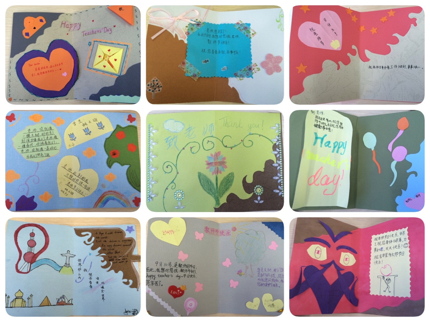 当上课归来的老师们惊喜于悄悄到来的鲜嫩植物时,其实学生们也在进行着另一项工程——手工心意卡的制作。他们用课余时间制作了小小的卡片,并在9月9日当天亲手将卡片送给亲爱的老师们。