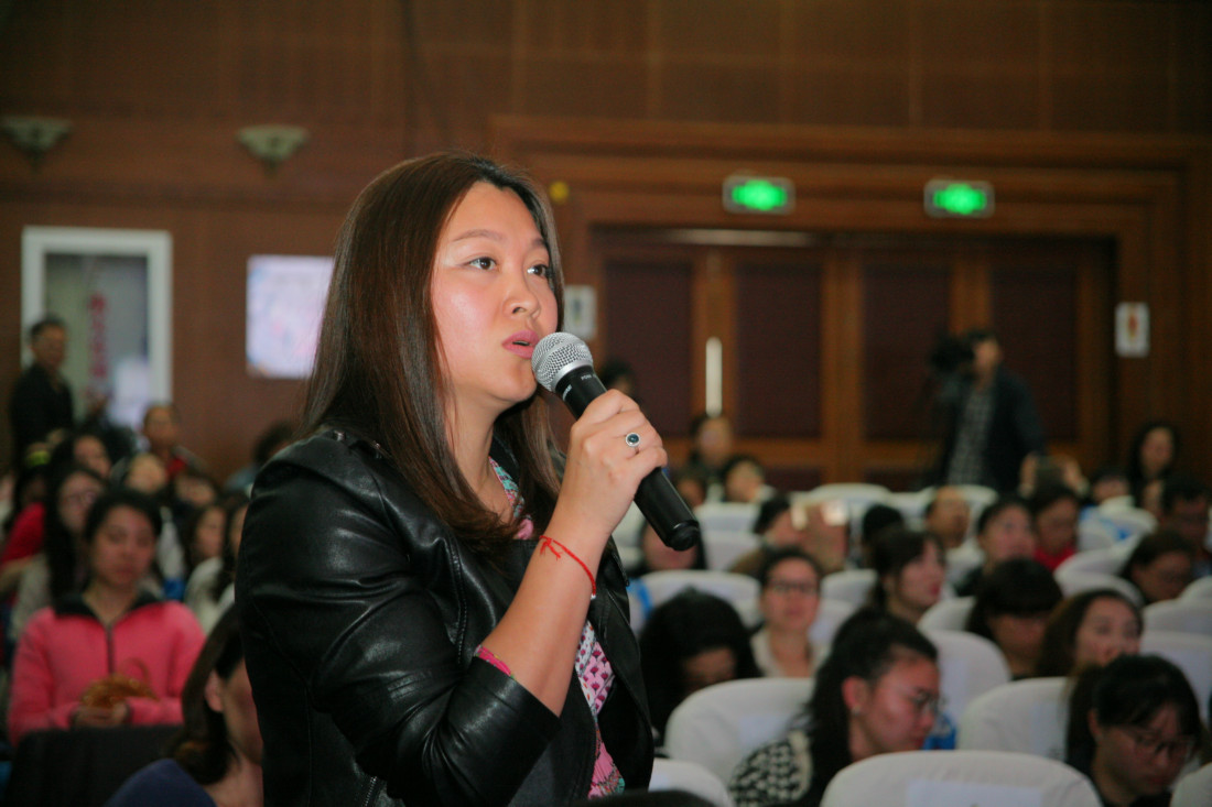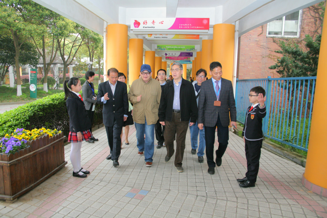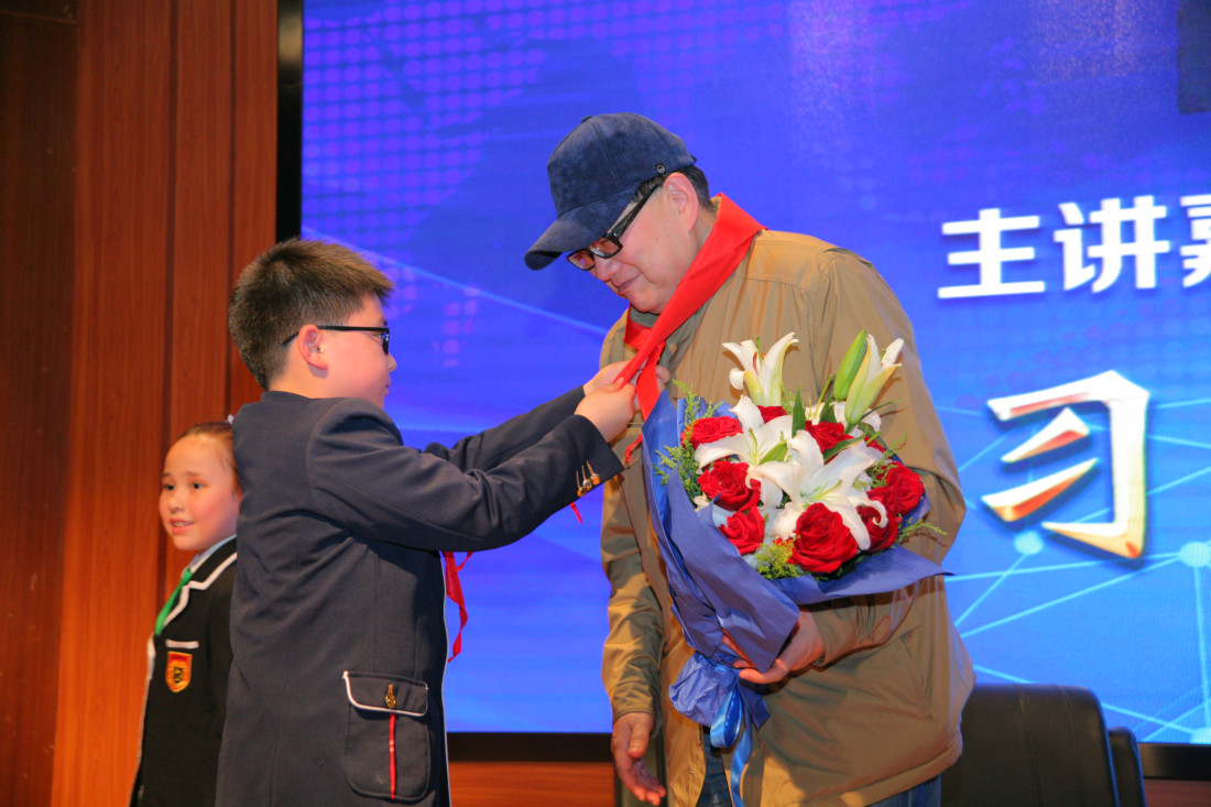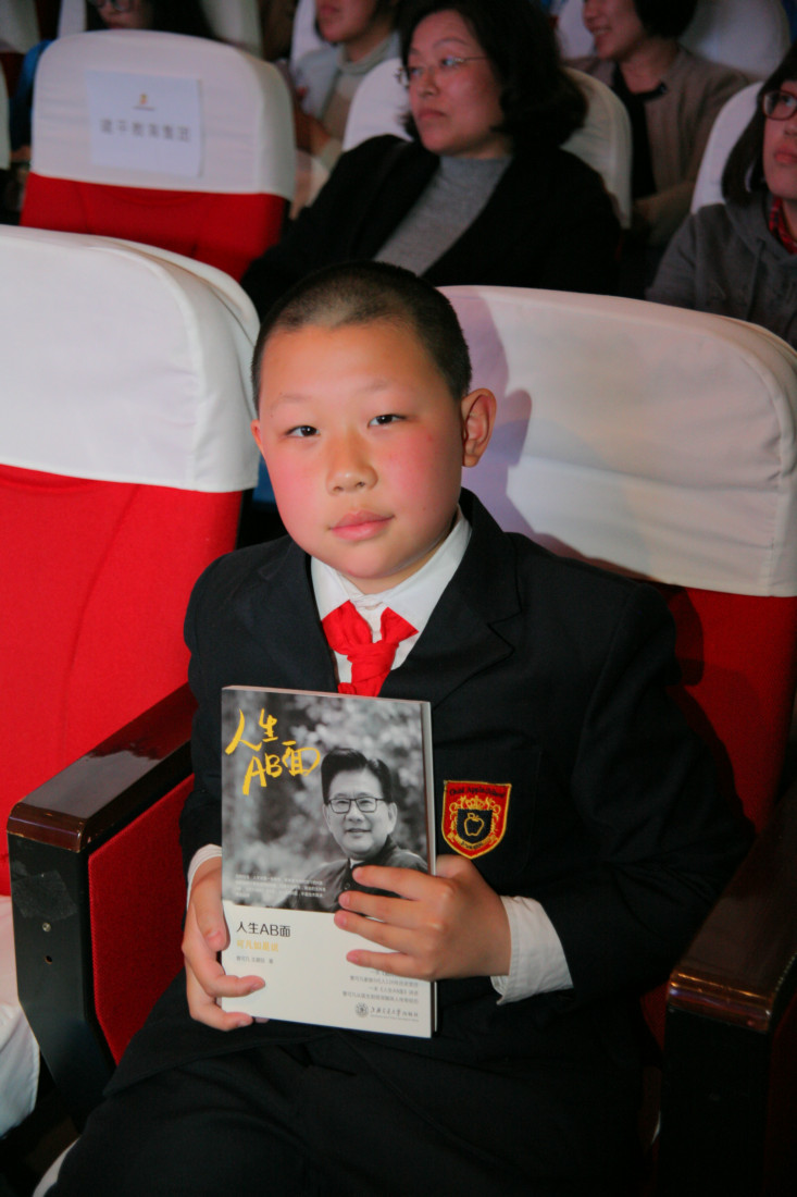 主要领导合影留念(左起依次:于家太、谭轶斌、尹后庆、曹可凡、张文荣、胡福臻) 金苹果学校创办人、亚龙集团董事长张文荣先生陪同介绍 曹可凡先生亲切与金苹果学生交流 论坛开幕倒计时 主持人谭轶斌老师讲话 曹可凡先生开讲 曹可凡先生的演讲非常精彩,在场观众座无虚席,整整近两个小时的聆听,不少观众拿着本子手写记录。 进入互动环节,曹可凡先生回答在场观众的提问及网络在线提问,每一个问题都力求解答详尽。 现场观众互动 金苹果学生提问 本次论坛采用了微信直播技术,在线问题提交及直播解答同时进行。 获得曹老师签名的出版书籍 金苹果学校少先队代表为曹可凡老师献花并系红领巾 与论坛工作人员合影留念