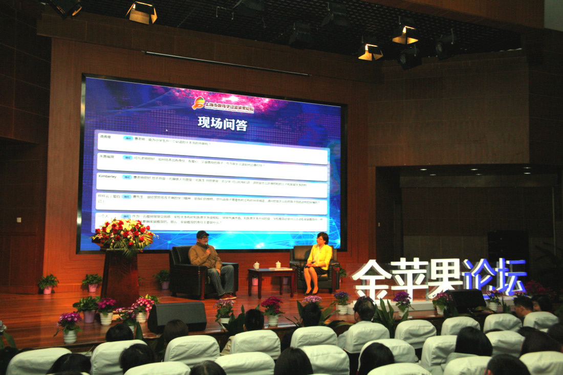 4月6日下午,在金苹果双语学校,上海市教育学会金苹果论坛上,沪上著名主持人曹可凡与来自全市的500多位中小学校长、优秀教师及家长聊起了学习和人生,他分享了个人的成长轨迹和享受学习的生活方式:在一个瞬息万变的社会里,家庭教育、学校教育、社会教育三者缺一不可,需要保持终身学习的能力。