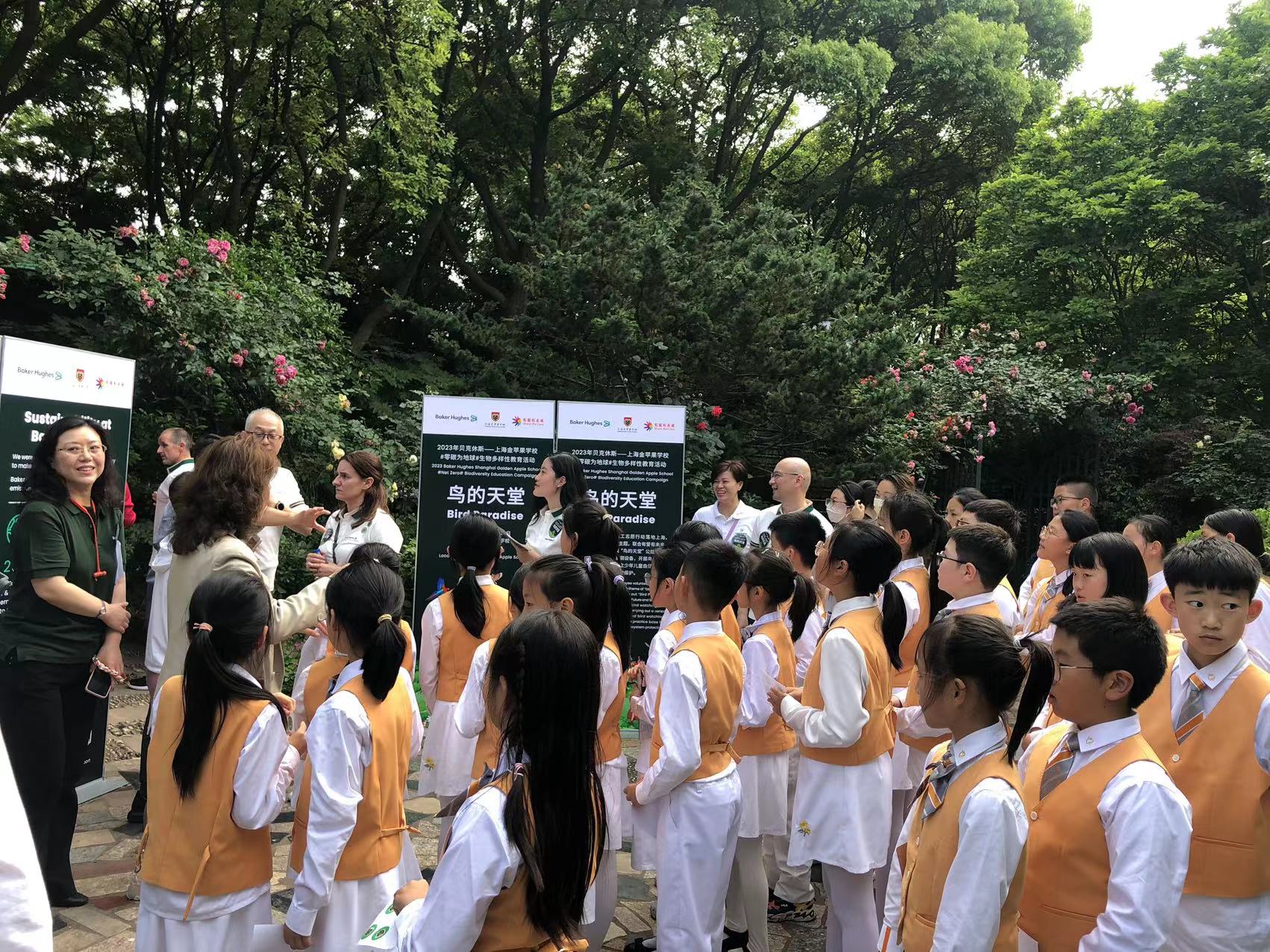 2023年5月25日下午,在上海金苹果学校的“鸟的天堂”举办了一场别开生面的活动,由小学部家委会牵头并促成上海贝克休斯(Baker Hughes)与金苹果学校共建鸟的天堂活动,通过保护环境、爱护鸟类为宗旨的活动,培养孩子们从小爱护环境,保护身边的鸟类,促进鸟类繁育发展。上海贝克休斯(Baker Hughes)作为全球知名的能源技术公司,致力于为全世界范围内各类能源和工业客户提供一系列行业解决方案,推动能源转型。在油气行业技术创新及发展中有近127年的历史,超过54000名员工为全球120多个国家和地区的客户服务。此次活动邀请到了金苹果学校创办人张文荣先生和上海贝克休斯(Baker Hughes)管理层主要领导,他们发出倡议并将促进金苹果鸟的天堂建设,通过建立鸟类繁衍观测站和观测直播,普及学生掌握相关科学的知识点,拓展眼界,学会保护和爱护环境及小动物。
