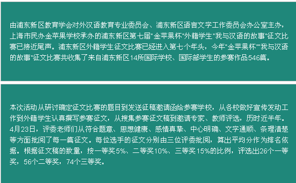 浦东新区开展外籍学生“金苹果杯”“我与汉语的故事”征文比赛
