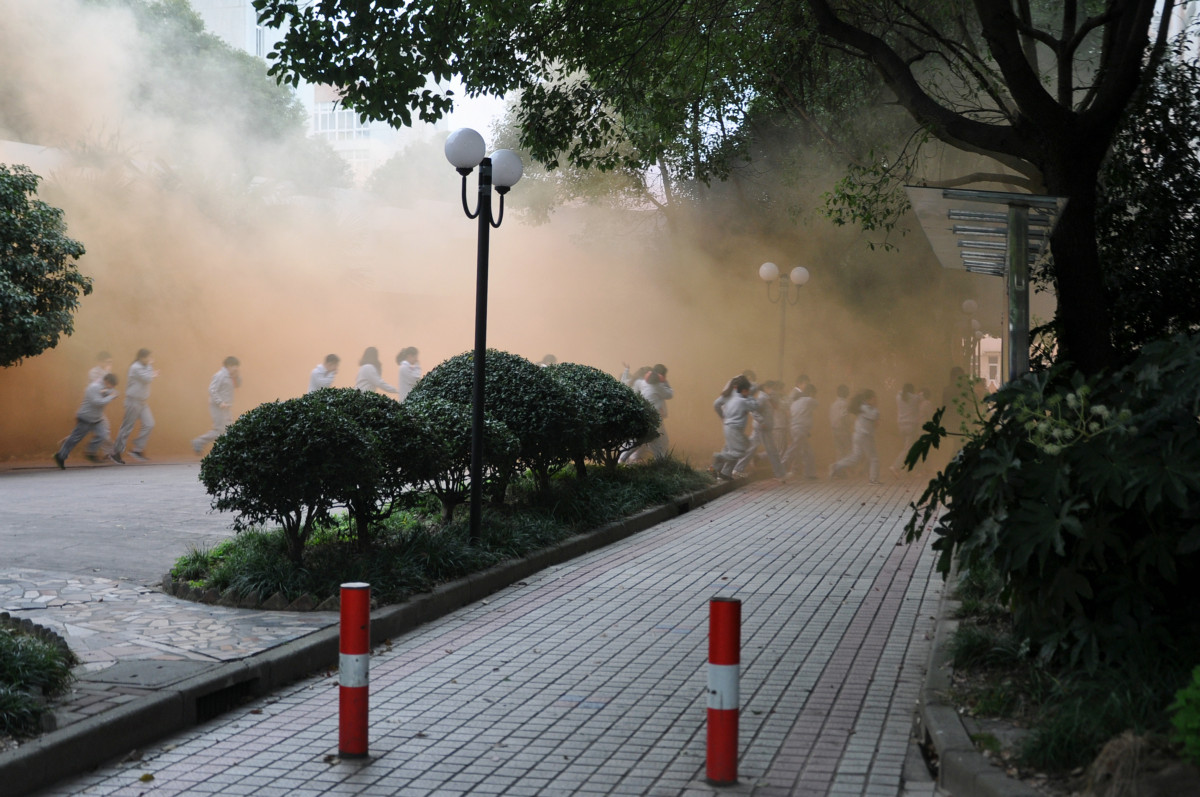 7:49:30时,警报响起,模拟火情爆发,学生老师撤离教室,奔向操场