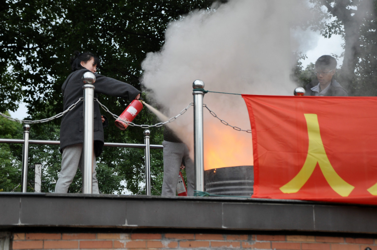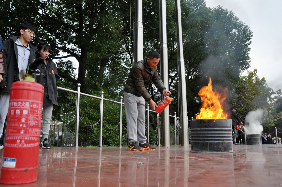 学生参与灭火演练