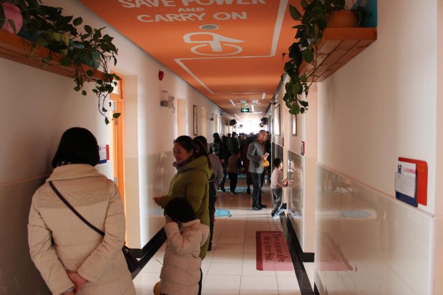 8:45分,家长带着孩子们进入校园,孩子们被以三年级钱浩宇同学为原型的卡通人物阿桃给吸引了,纷纷与阿桃握手、合影。虽然家长和孩子们众多,但因为学校和老师们的连日辛苦奋战,签到和引导工作有条不紊的进行。沿路引导的可爱又有礼貌的小苹果们,获得了家长们的频频赞叹!咨询的窗口更是热火朝天,老师们针对家长的问题贴心地一一回复,让处于幼升小焦虑不安情绪中的家长们得到满意的答复。
