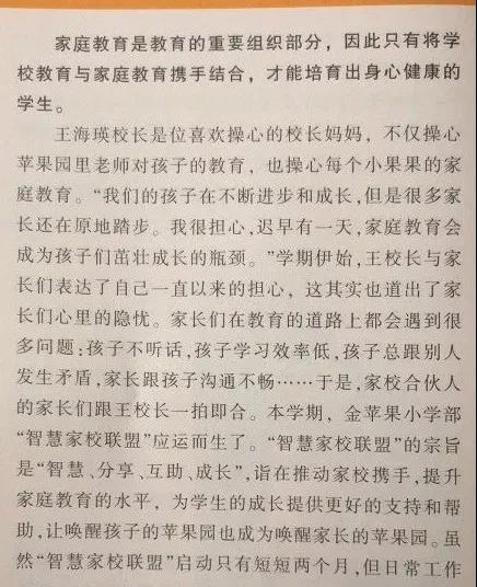当然,每一个尝试都不会是一帆风顺的。在“唤醒课堂”的实践中,学校和家庭都不约而同地认识到:单靠一方力量想从根本解决孩子们成长中的所有问题,这几乎就是一个“不可能完成的任务”。学校和家庭需要建立一个合适、健康、有效的合作关系,发挥出各自的优势,取长补短、相互配合。于是,上海市民办金苹果学校小学部联合“家校合伙人”创建了“智慧家校联盟”。她的目标就是配合学校一起唤醒孩子、唤醒家长。让我们和孩子间能建立起一种无障碍交流的伙伴式关系。