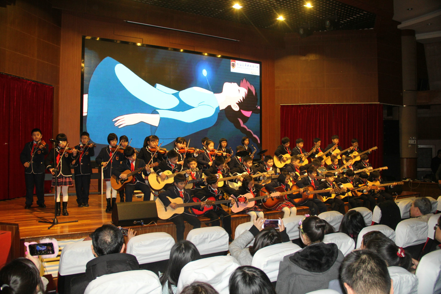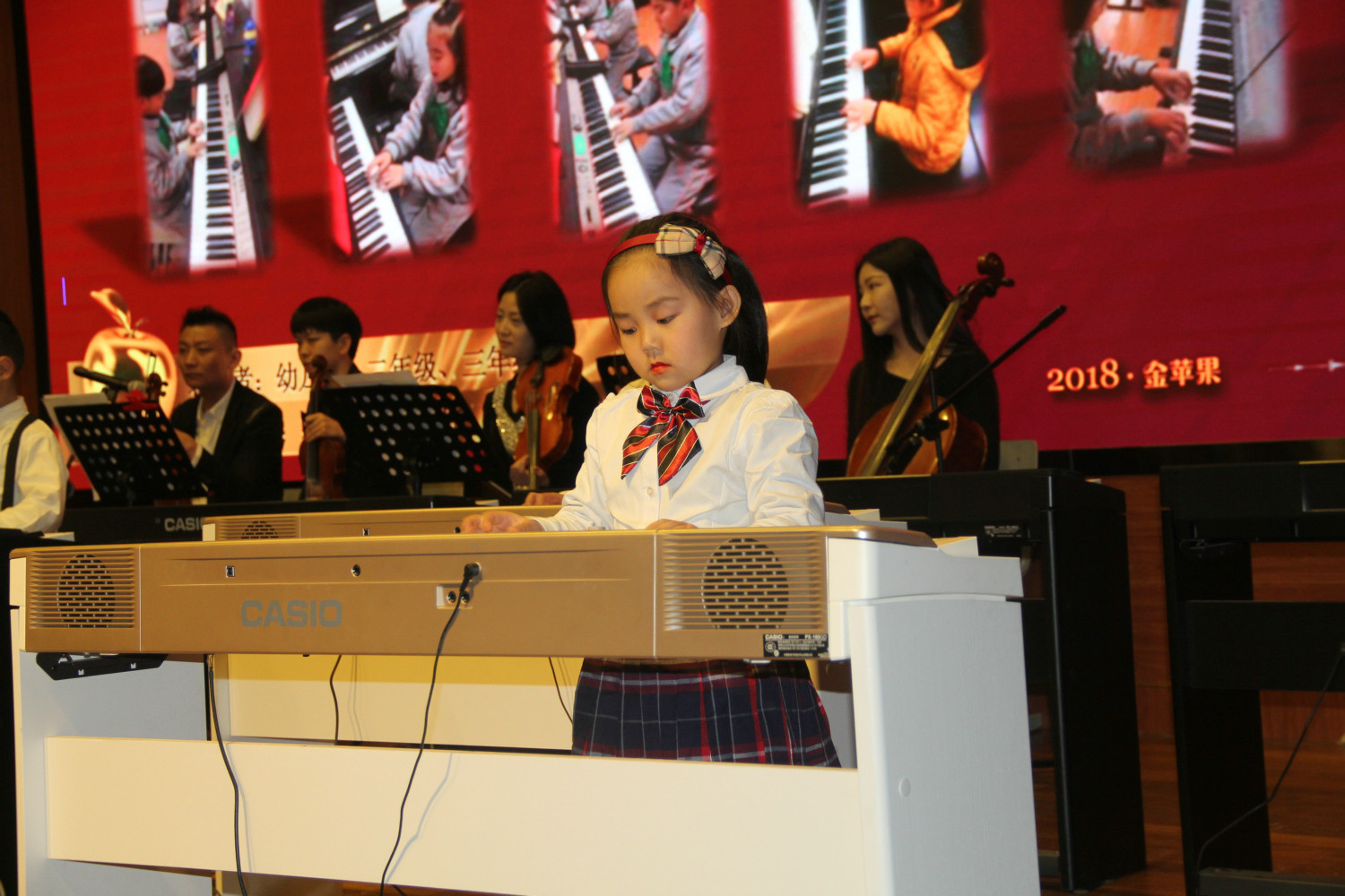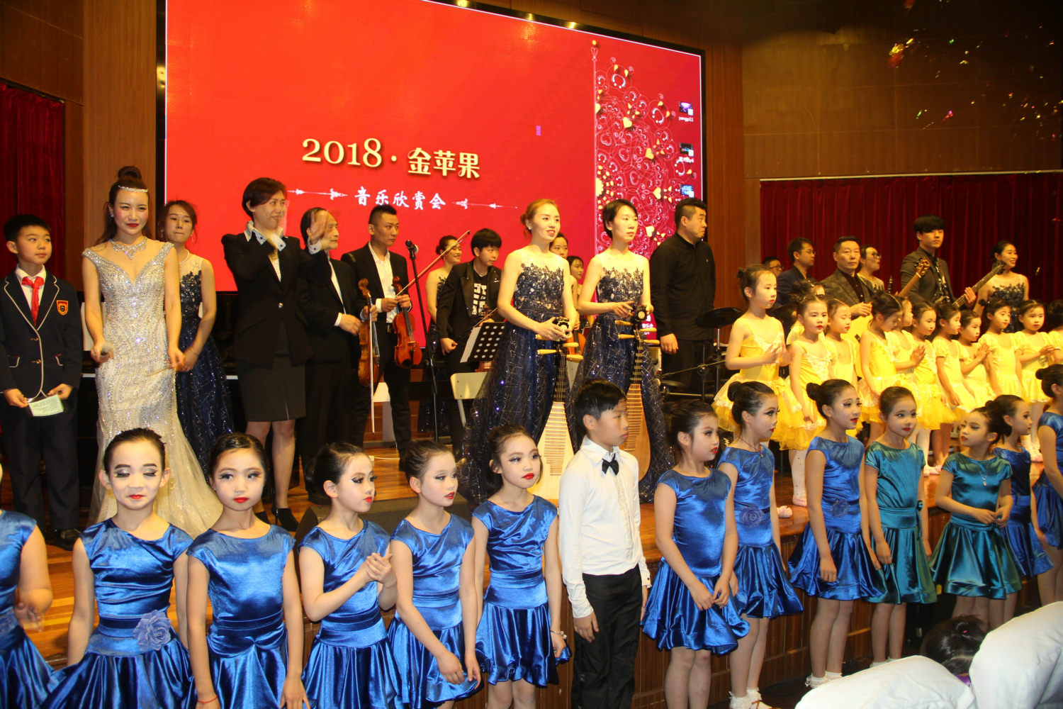 2018新年音乐鉴赏会相比之前,在技术上以动画为背景,动与静的完美结合,为整场音乐会添加了不一样的色彩,此次的表演也获得了老师,家长们的一致好评,也见证了在2017年里小朋友们用自己的勤奋、努力有了今日的成绩,在成长过程中经历过的磨练让自己更强大,也见证了金苹果艺术中心不容小觑的强大实力。