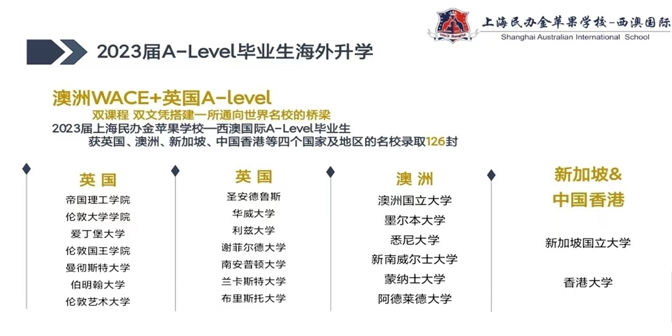 上海民办金苹果学校-西澳国际(原上海澳大利亚国际高中)创建于2008年。是由澳大利亚西澳洲教育部授权开设在中国上海金苹果学校的一所澳洲海外精英高中,学生注册澳大利亚本土学籍,参加澳洲高考,毕业后可获得由澳洲教育部颁发的高中毕业证书。学校同时提供英国牛津 AQA A-LEVEL课程。办学十八年,培养16届毕业生进入世界名校就读。