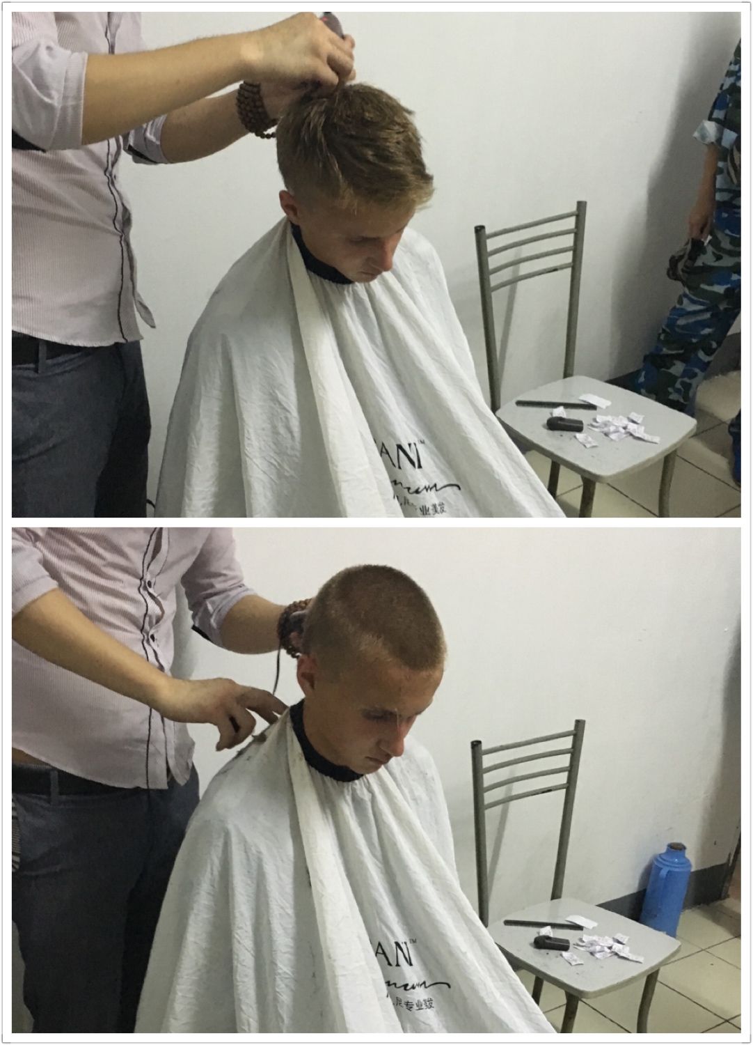晚饭后进行军训的传统规范内容——理发,每个同学统一剃成了9毫米的平头,来自俄罗斯的同学也不例外,入乡随俗理了个平头。剃完头的同学们越发充满男子气概。