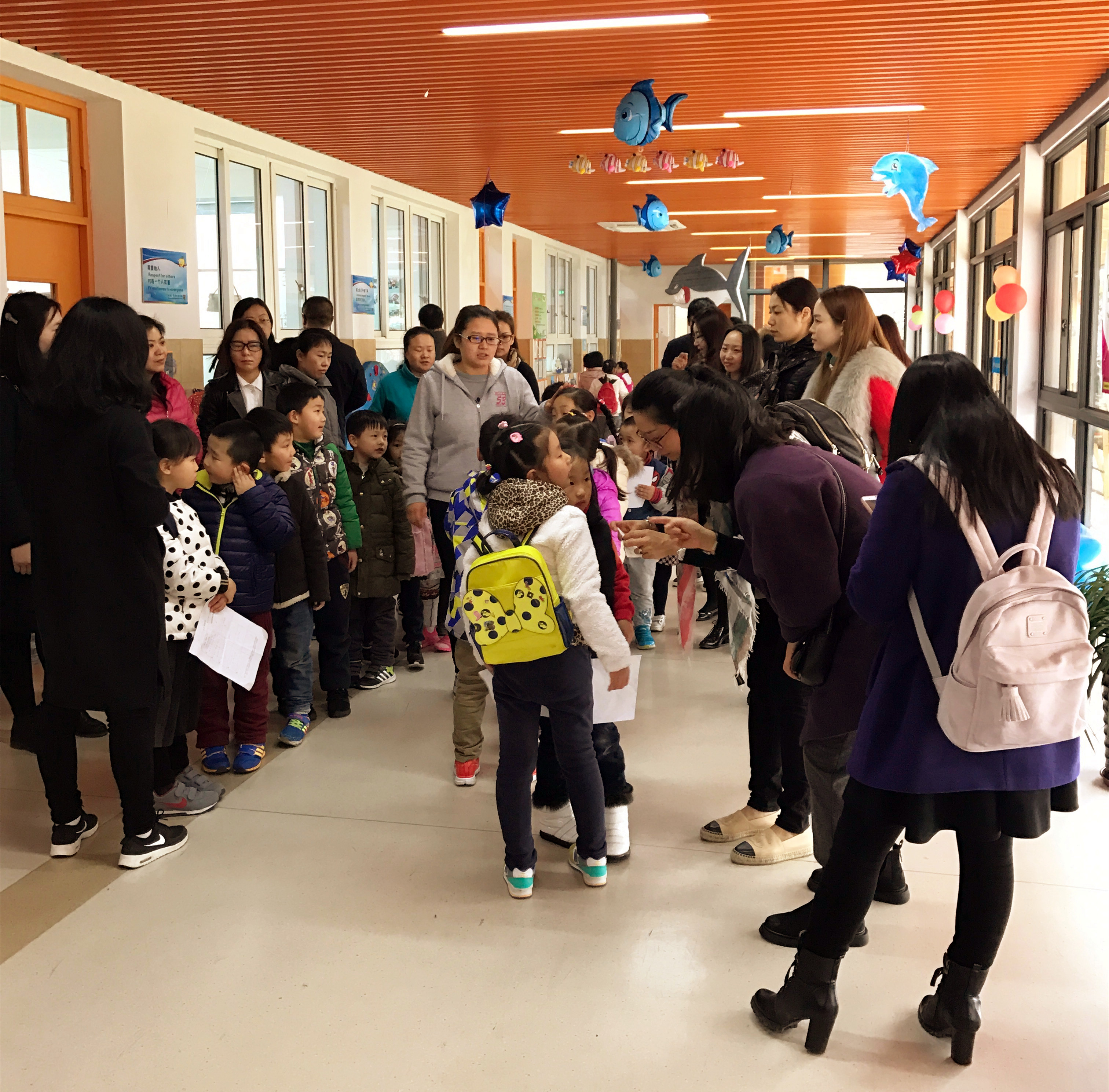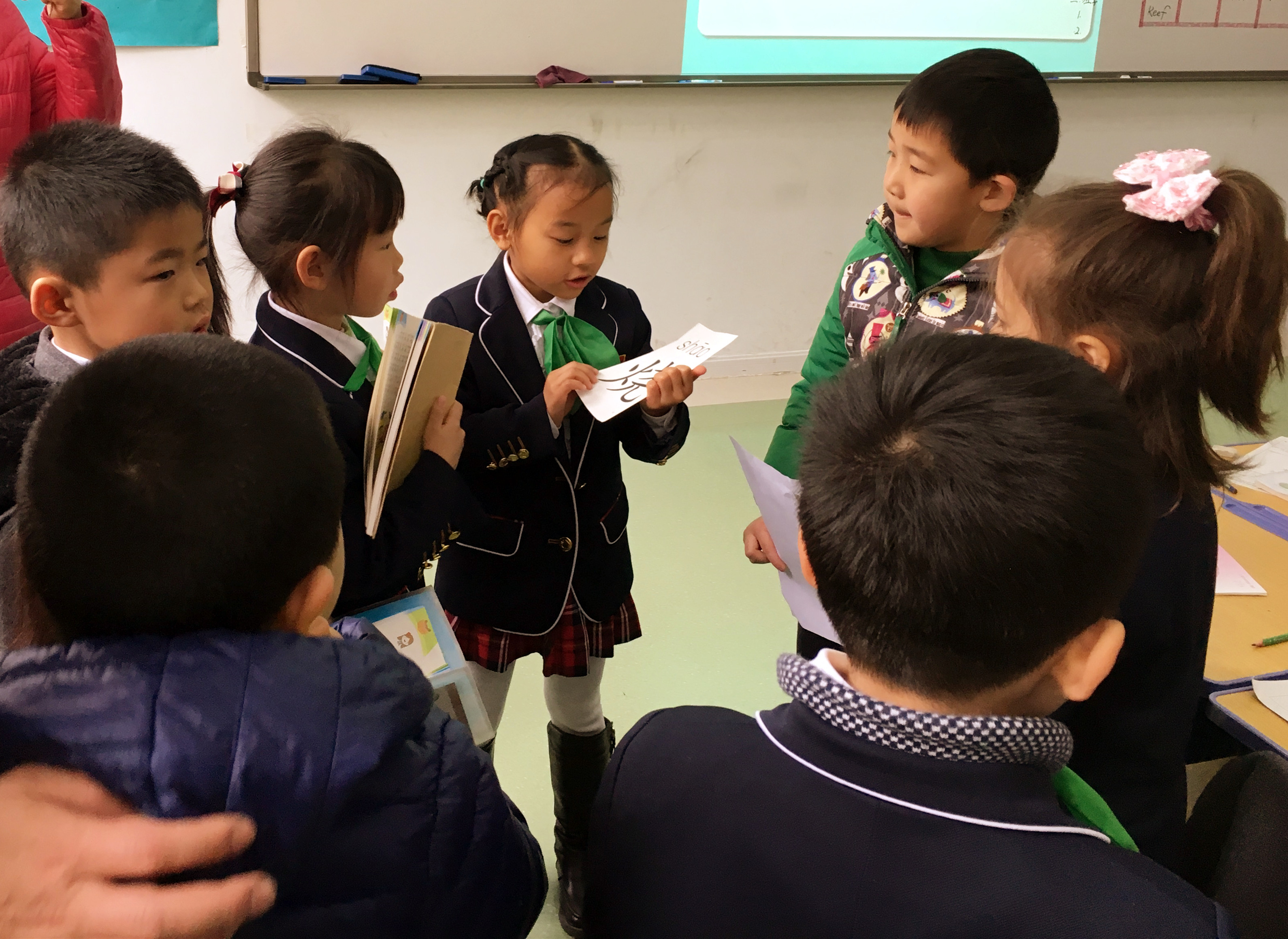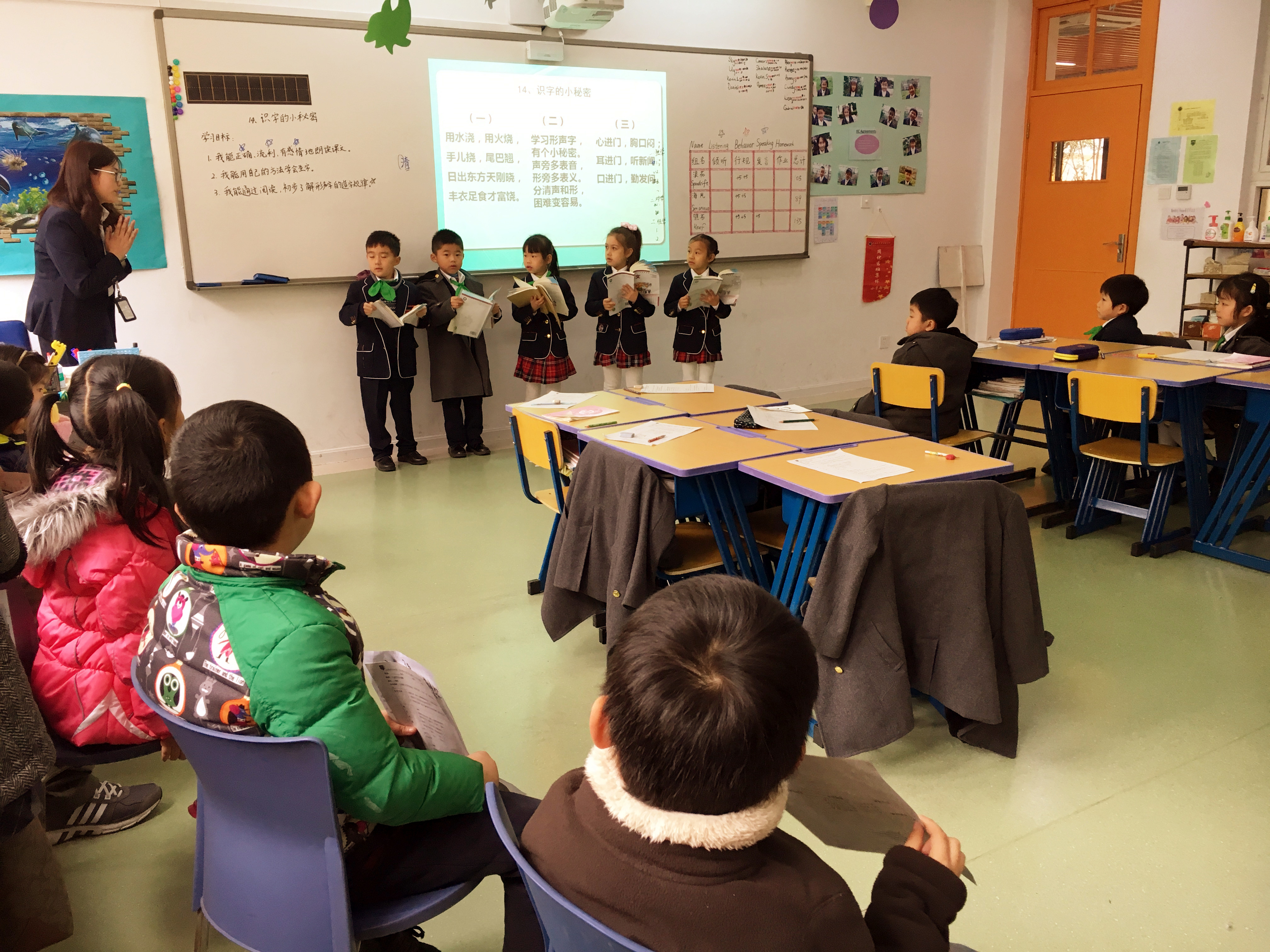 分班走进了金苹果双语学校小学部的国际剑桥班参观,我们耐心等待着近距离观摩了哥哥姐姐们的课堂教学活动。