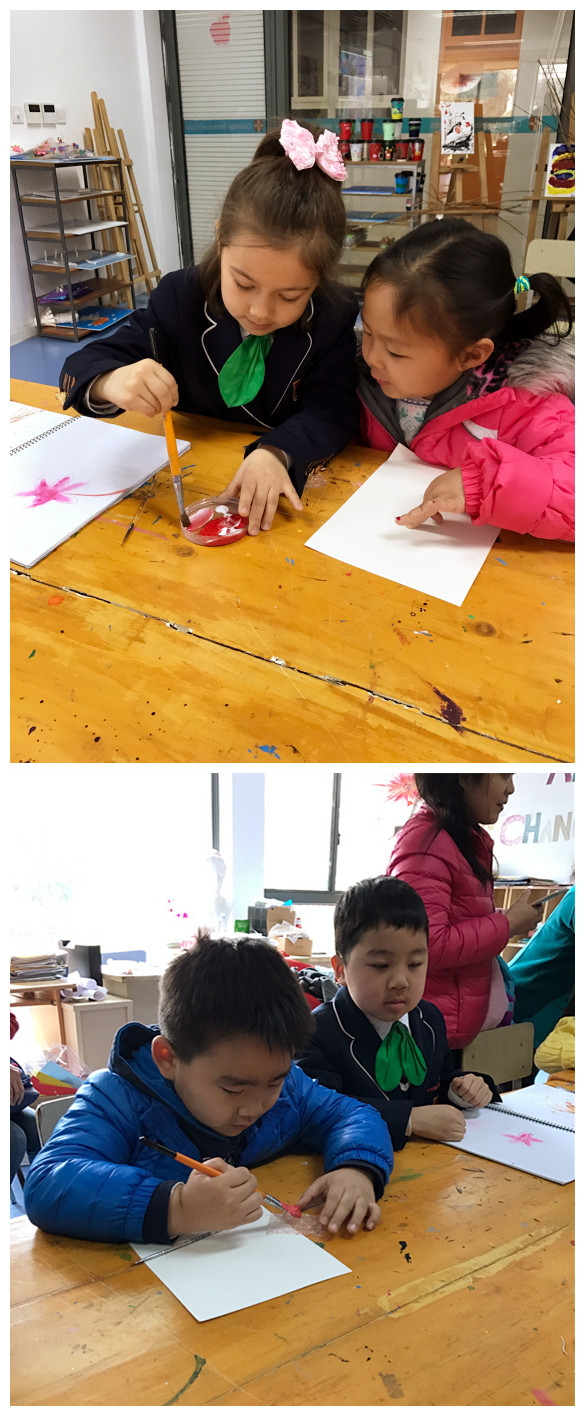 创意美术课,我们跟着一年级哥哥姐姐们来到了美术专用室,跟着漂亮的外教老师一起用泡沫纸和颜料来画一棵美丽的桃树。