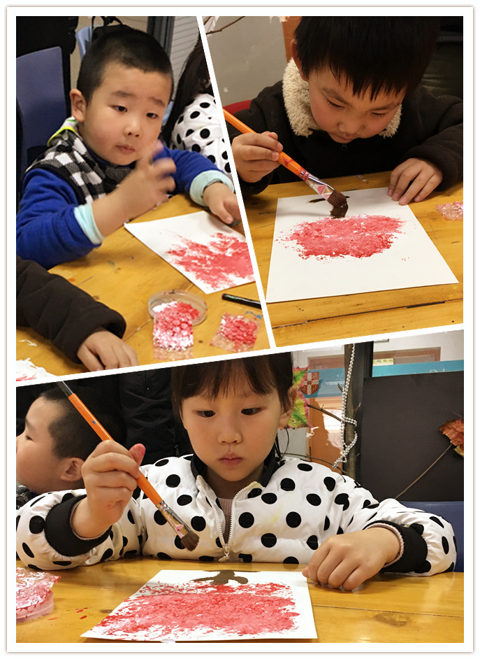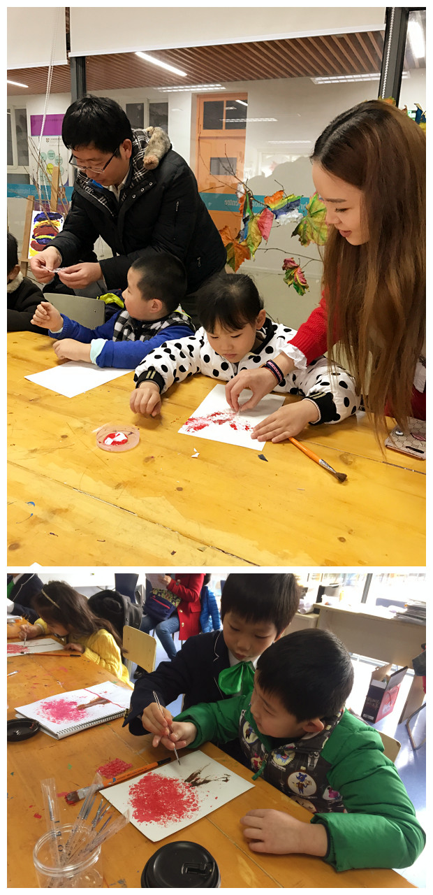 不要着急,妹妹看清楚哦,红色的颜料和白色的颜料搅拌一下,就变成桃花的颜色了。