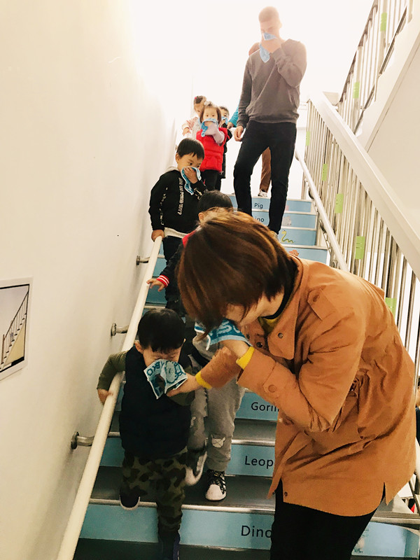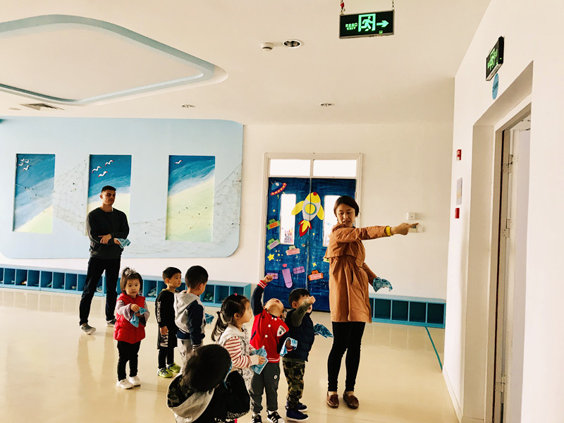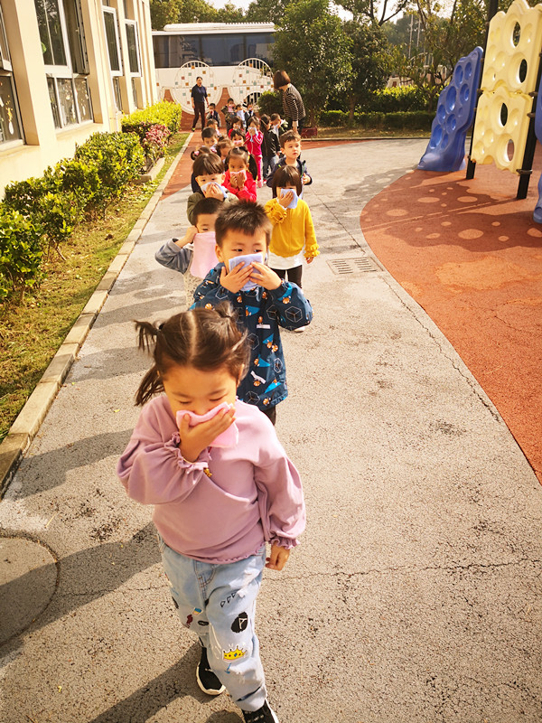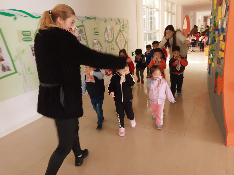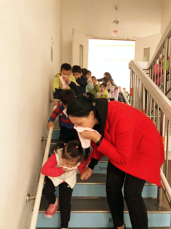 11月9日的上午10点我们开展了一次消防紧急疏散演练。当“警报”声响起时,我们小朋友们一个接一个迅速的用湿毛巾捂住口鼻,弯着腰,手扶楼梯的栏杆,不吵不闹,紧张而有序的按逃生路线撤离班级,到达安全的区域。