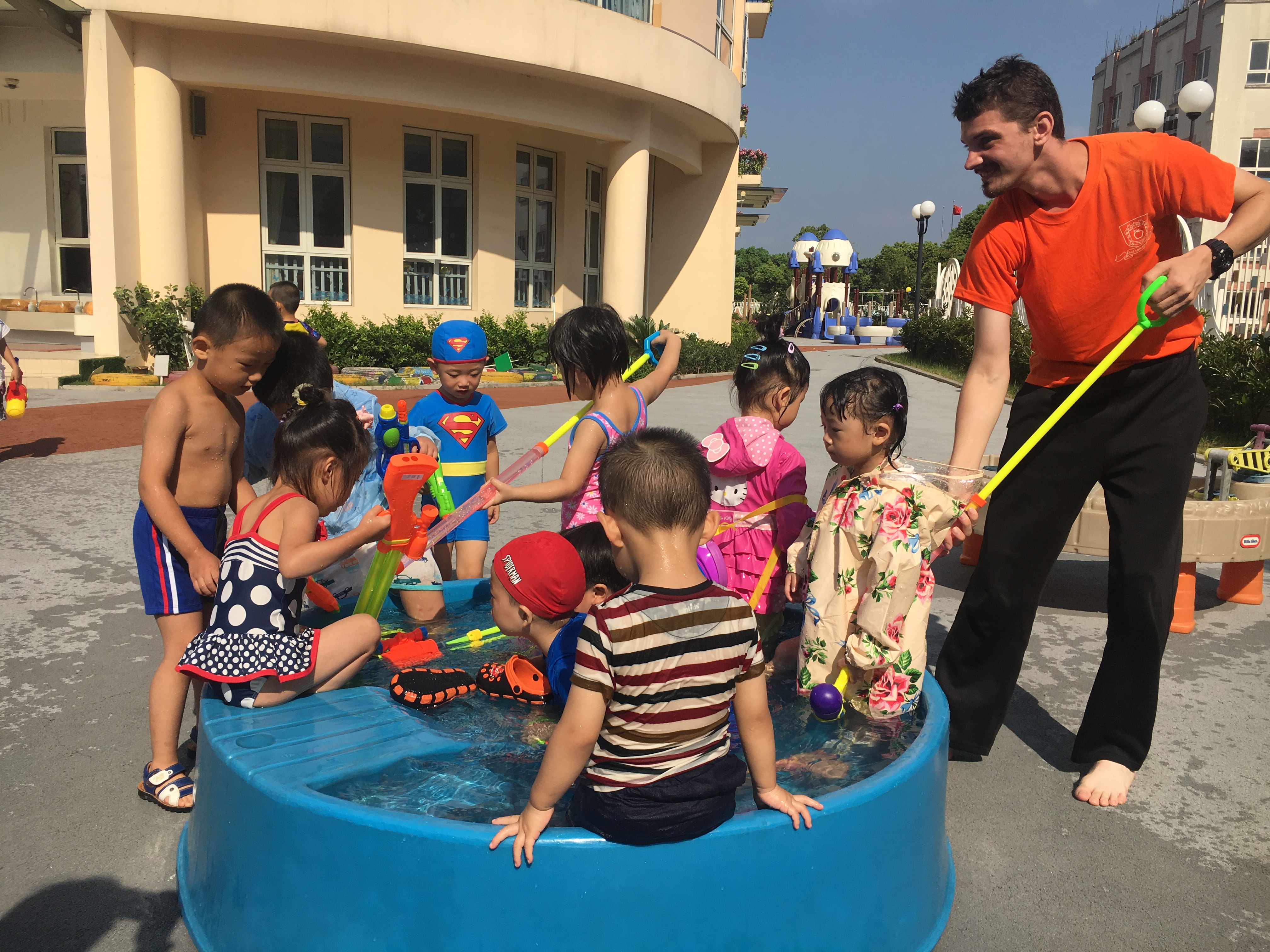 原来呀~他们在和外教老师对战呢!你看,外教老师的水枪好长啊!到底是谁赢了呢?