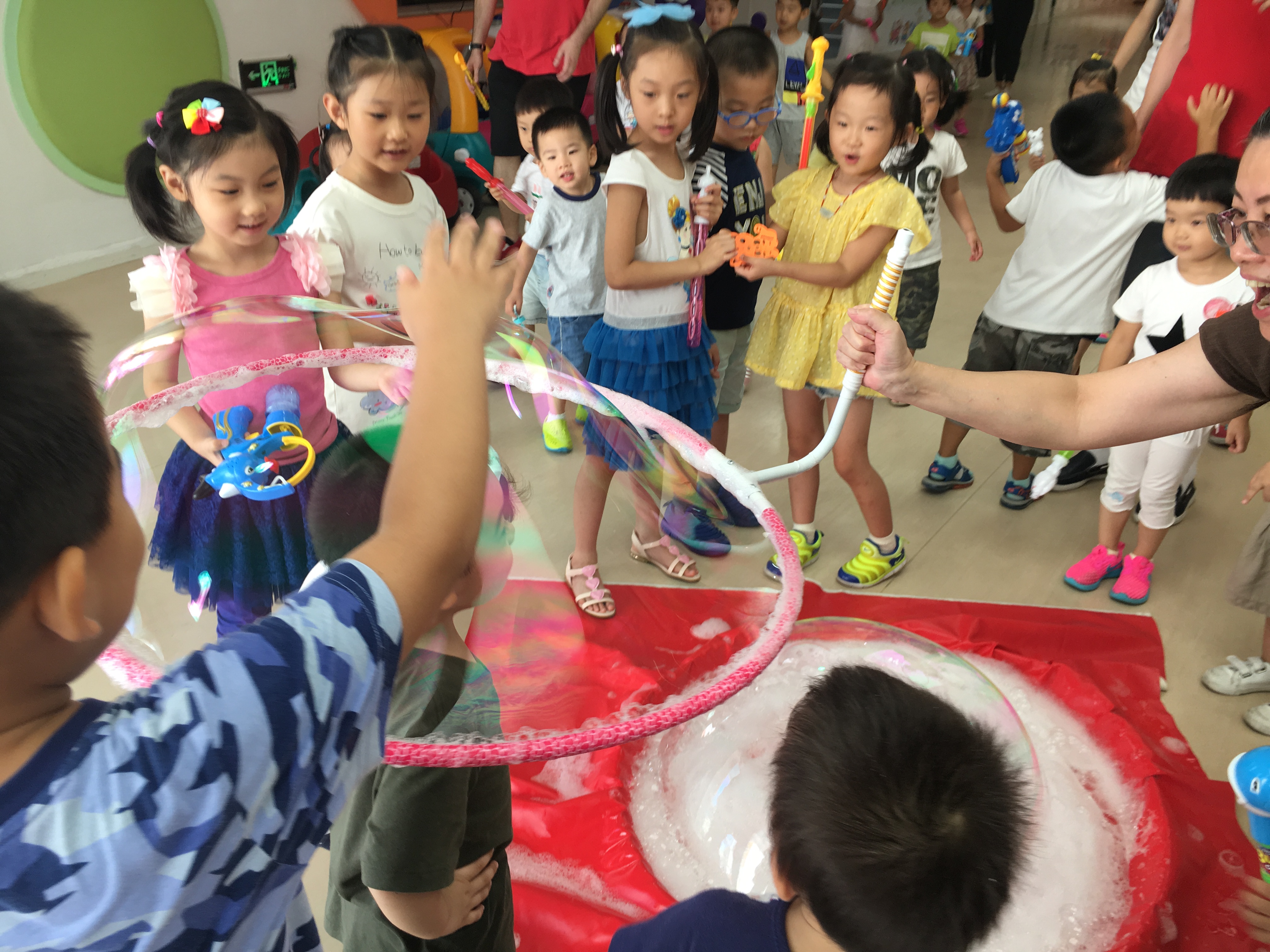 外教老师也忍不住想来尝试一把,看来技术还是不错的哦。但园长妈妈还是略胜一筹,我们都可以躲进大泡泡里捉迷藏了。
