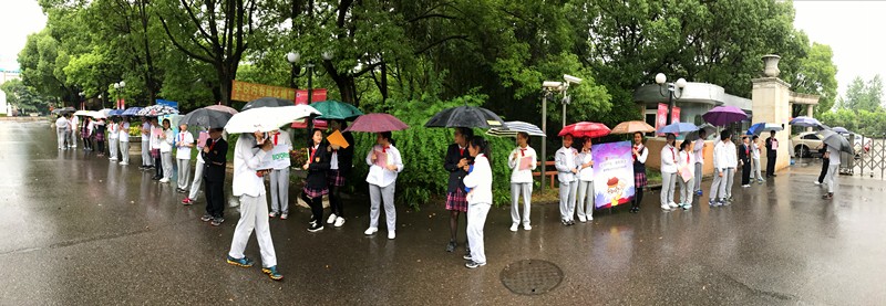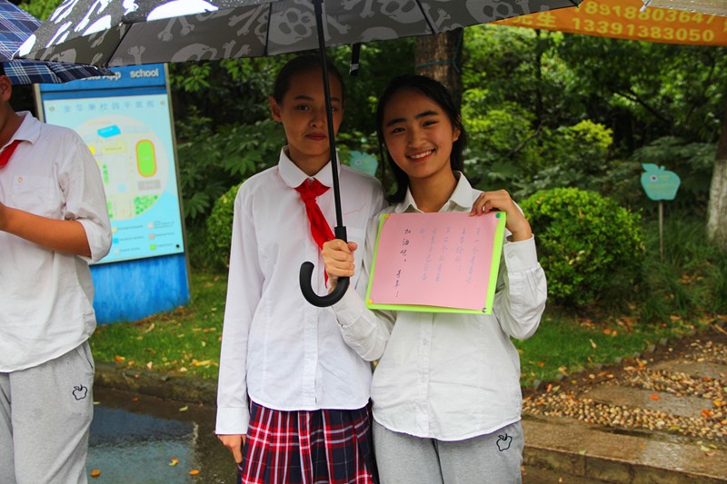 虽然是第八节课时间,虽然此时下着中雨,但是不少同学仍然请假,来为高三的学长学姐们送行。
