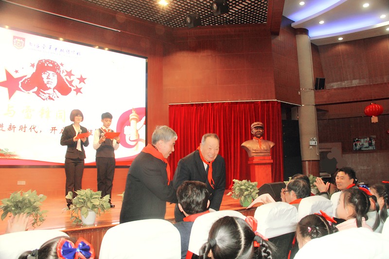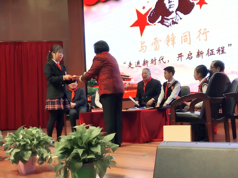 大队长沈佳韵同学接受礼物并带领队员们庄严承诺:学习雷锋精神,做雷锋传人。