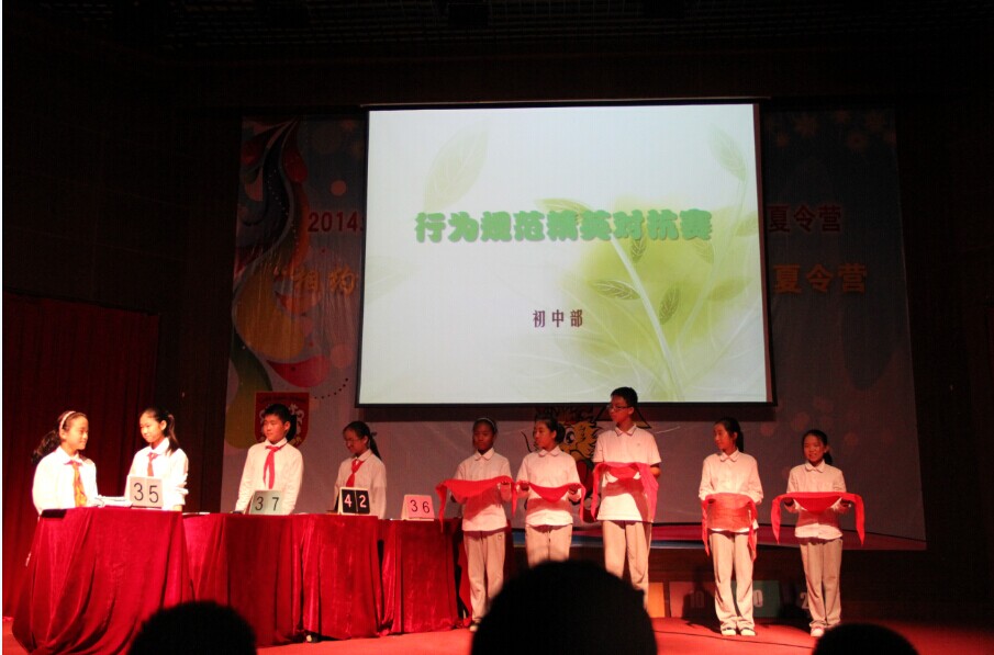 分为“文雅小诗”、“光影流年”、“边学边玩”、“千里之行始于规范”四个环节的行为规范精英对抗赛在选手们做完自我介绍后就正式开始了,他们分别是来自预备1班的徐欣奕、预备2班李佳婧、预备3班钱涛、预备4班娄彭咏烨、预备剑桥班的李姌歌。他们在大家的欢呼中闪亮登场!