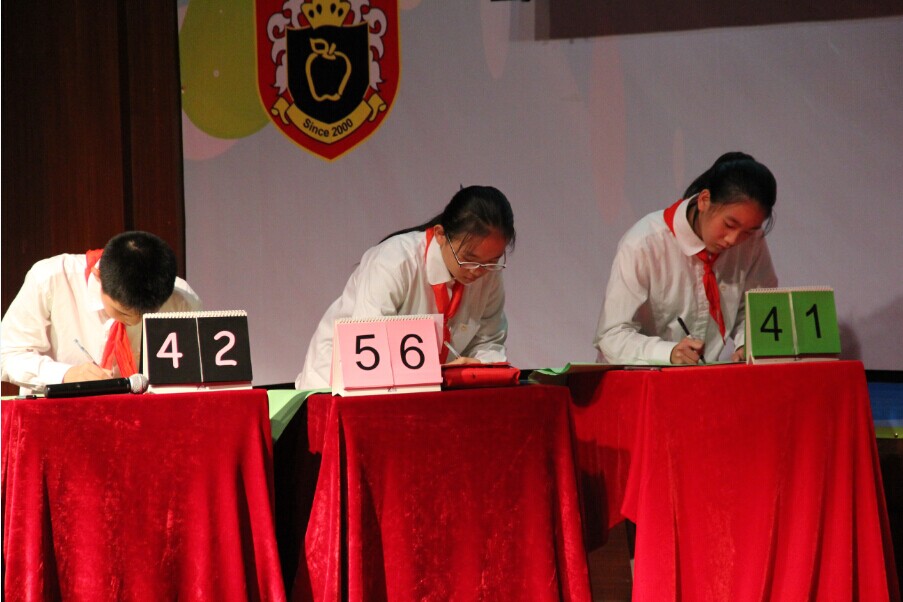 在几番问答之后,我开始进入状态,却因为系红领巾比赛的速度不够快而失去了宝贵的答题机会,不禁有点自责。在写杜绝校园垃圾的方案时,一开始担心时间不够,匆匆的写,后来发现时间比较充足的时候已经不能做太多的改动,又十分的担心。
