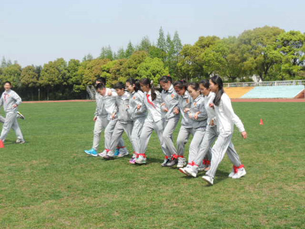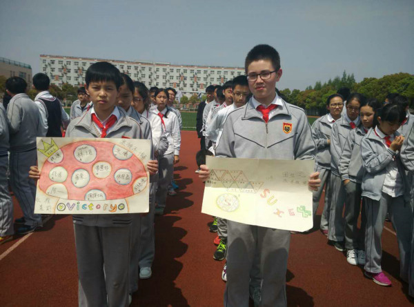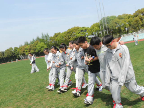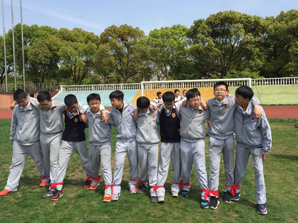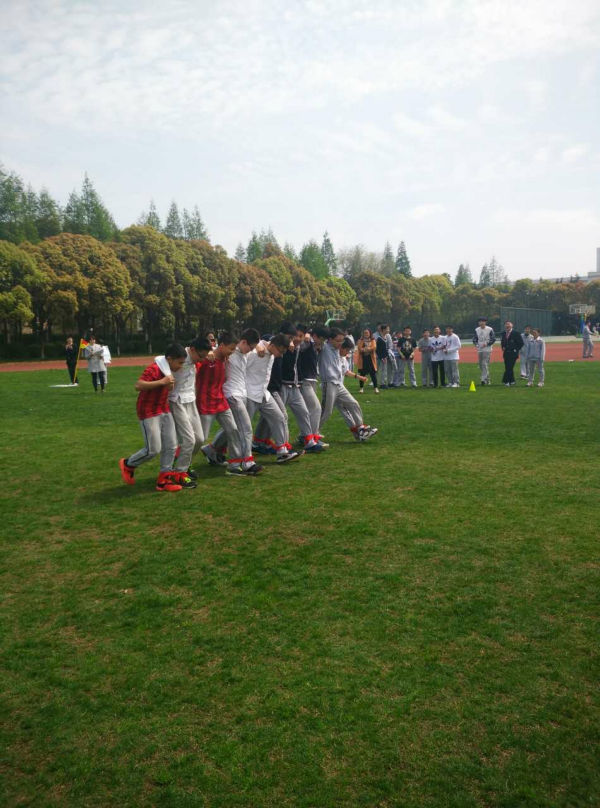 初一剑桥班的Super hamburger队顶住压力,随后也开始了他们的比赛。没想到不给力的绑腿带出现了本场第二次脱落,拖下了前行的进度,成绩远远落后。但这并不影响孩子们的热情,因为前一队“团结就是力量”的响亮歌声还在每一位在场人员的心中回荡。