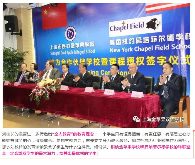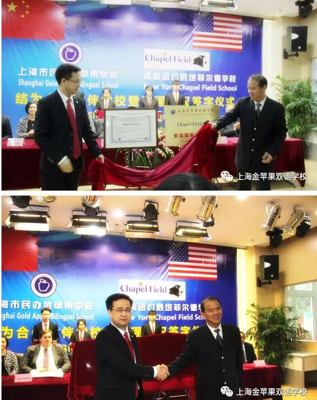 2017年3月23日,上海金苹果双语学校与美国纽约启培菲尔德学校正式签约,成为了战略合作伙伴学校。