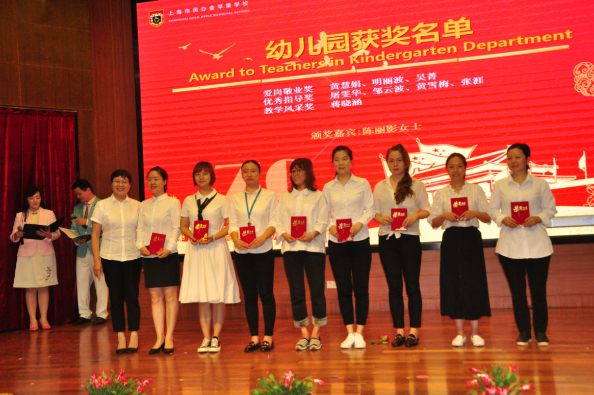 会上校领导为在本年度获得区园丁奖、优秀党员的教职工颁发了奖状、为在本年度指导学生参加市、区教育教学活动中取得优异成绩的教师颁发了奖状。