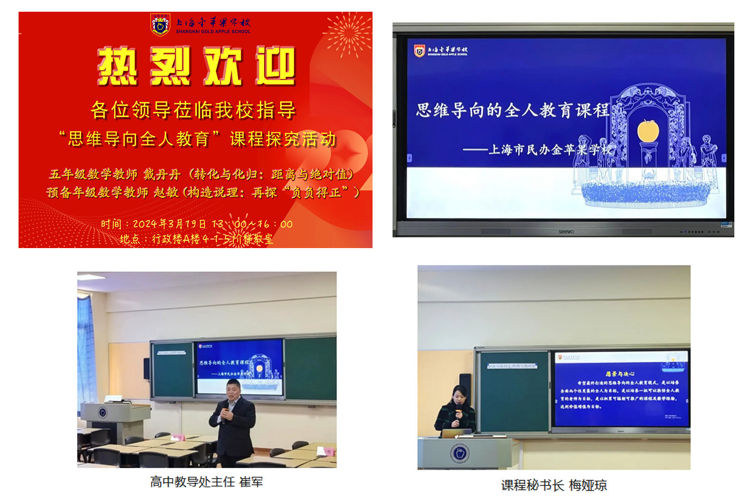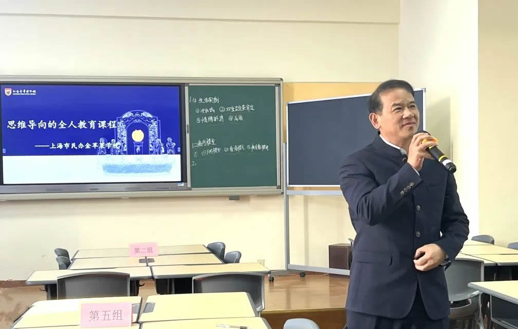 2024年3月19日下午13:20分在金苹果学校行政楼A楼415阶梯教室举行了一场精彩的思维导向全人教育探究课,也是金苹果思维导向课程第二阶段探究课展示与研讨会。此次请到了华东师大相关领导、专家,高行学区学校领导、教育集团领导、学校教学老师和校领导参加。探究活动由学校高中教导处主任,思维导向课程副组长崔军主持。思维导向课程秘书长梅娅琼主任开场就回顾了第一阶段思维课程各项工作推进情况和成果。