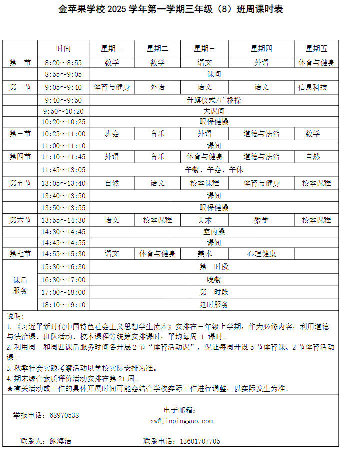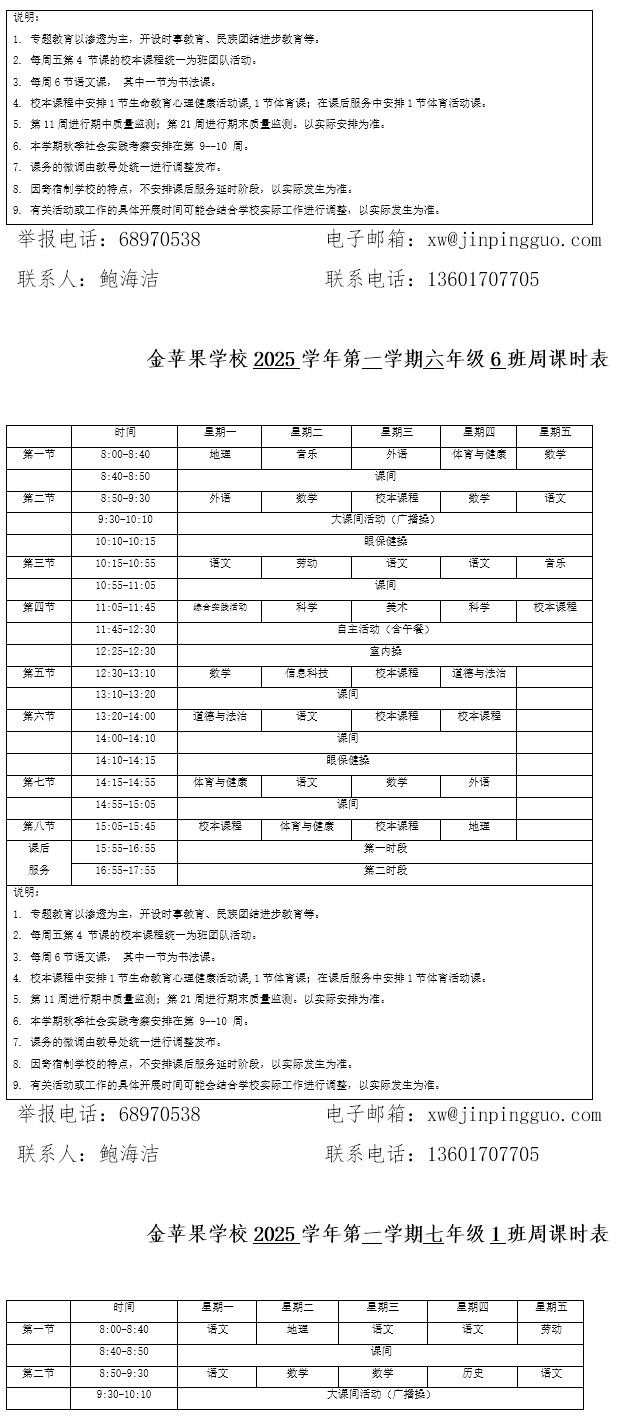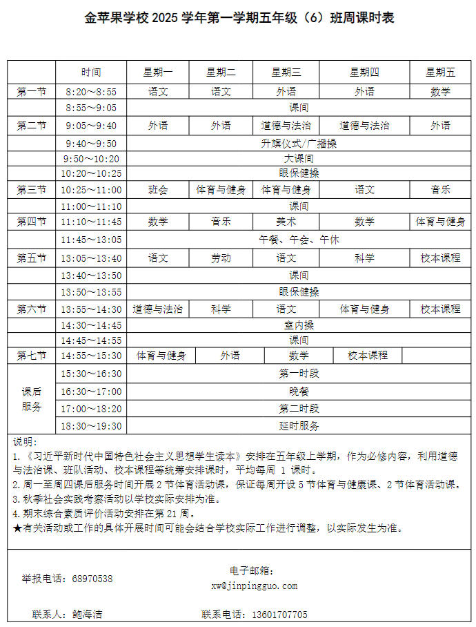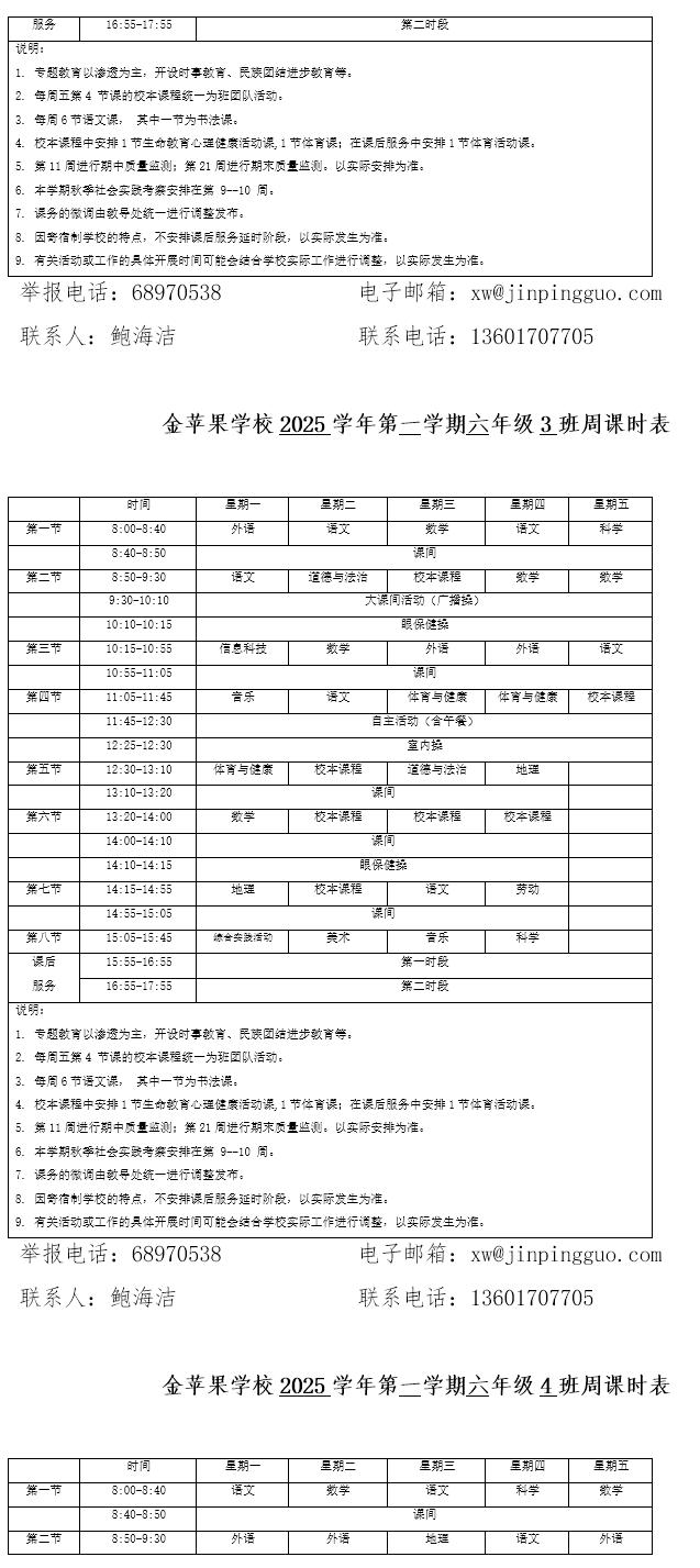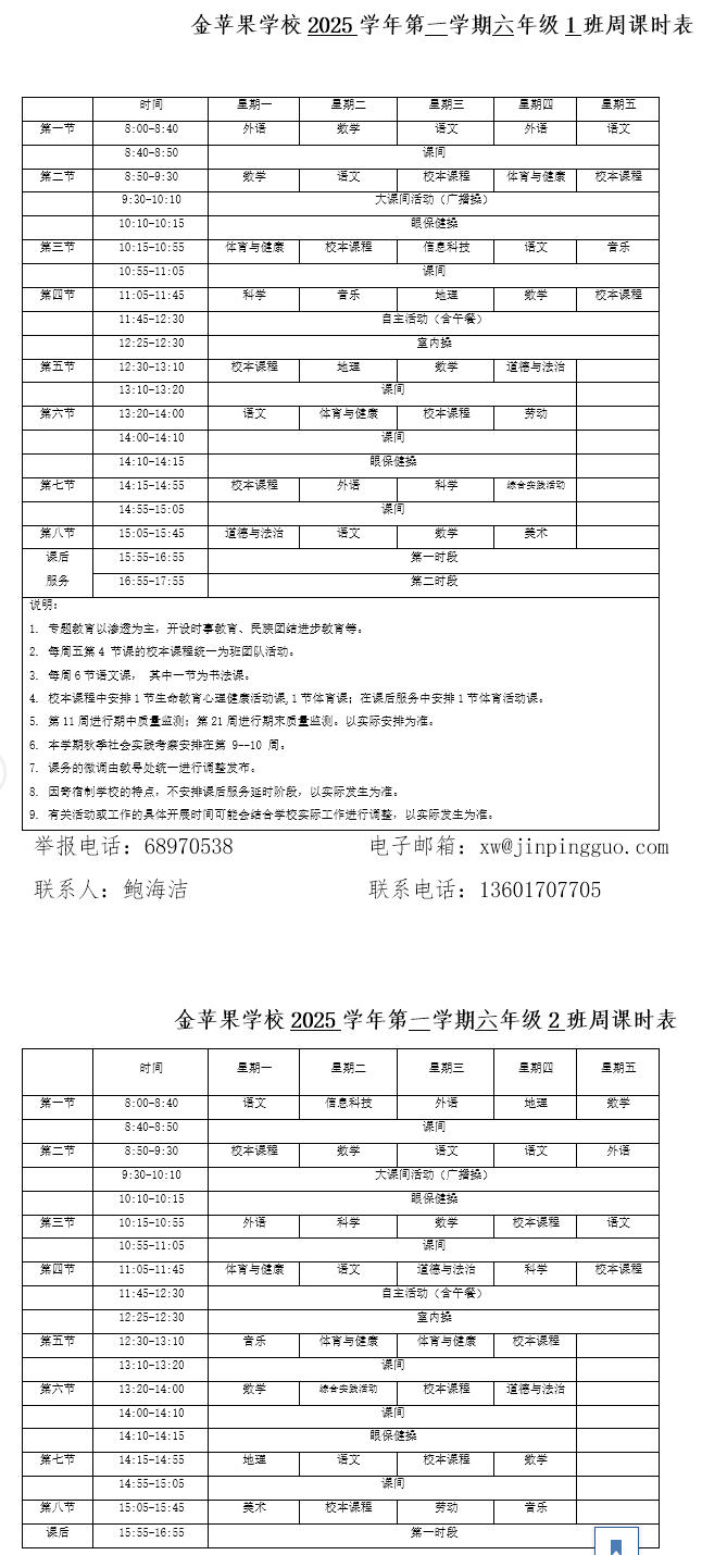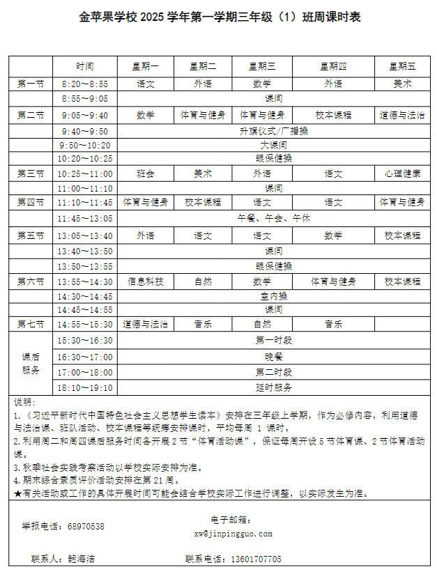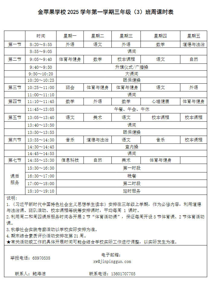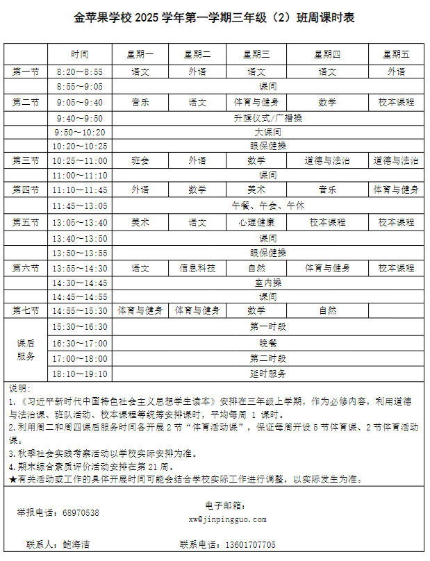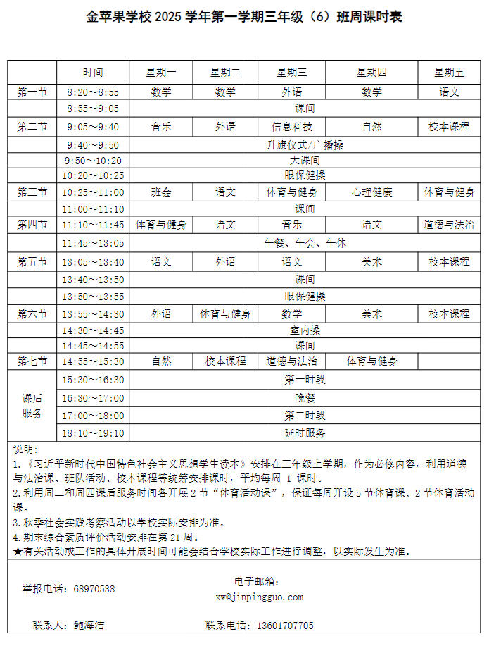 为深入贯彻落实中办、国办《关于全面加强和改进新时代学校体育工作的意见》、《关于全面加强和改进新时代学校美育工作的意见》和市教育局关于“晒课表”相关文件精神,严格落实学校体育、美育、劳动教育课程开设刚性要求,按照国家课程方案和课程标准开齐开足上好体育美育劳动教育课,开展好课后体育美育劳动教育活动,使学生掌握更多的运动技能,拥有更多的艺术特长,收获更多的劳动体验。现将我校所有年级课程表进行公布,自觉接受家长和社会监督,落实“增效减负提质”的要求。