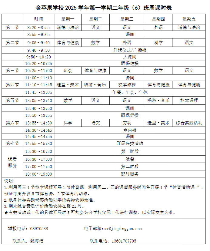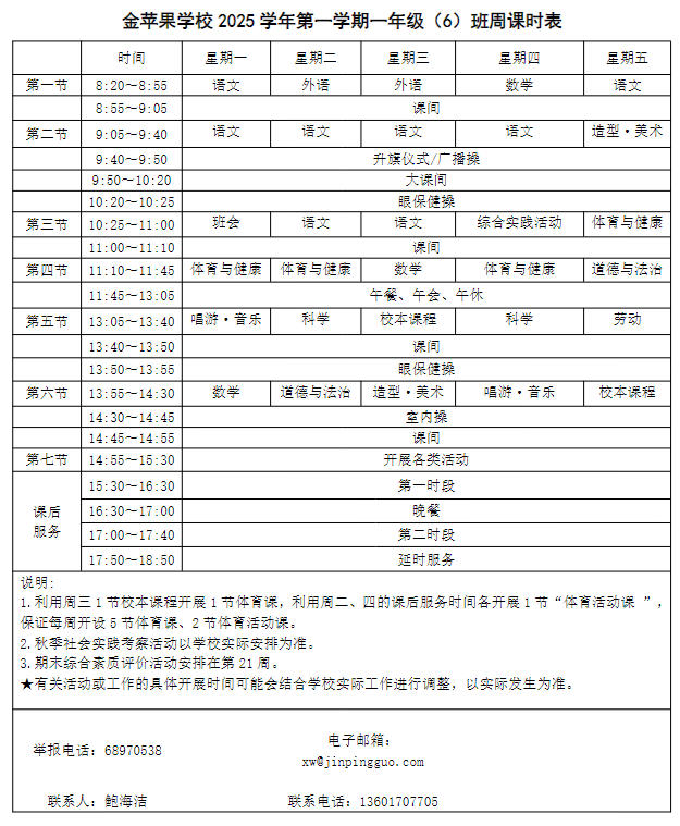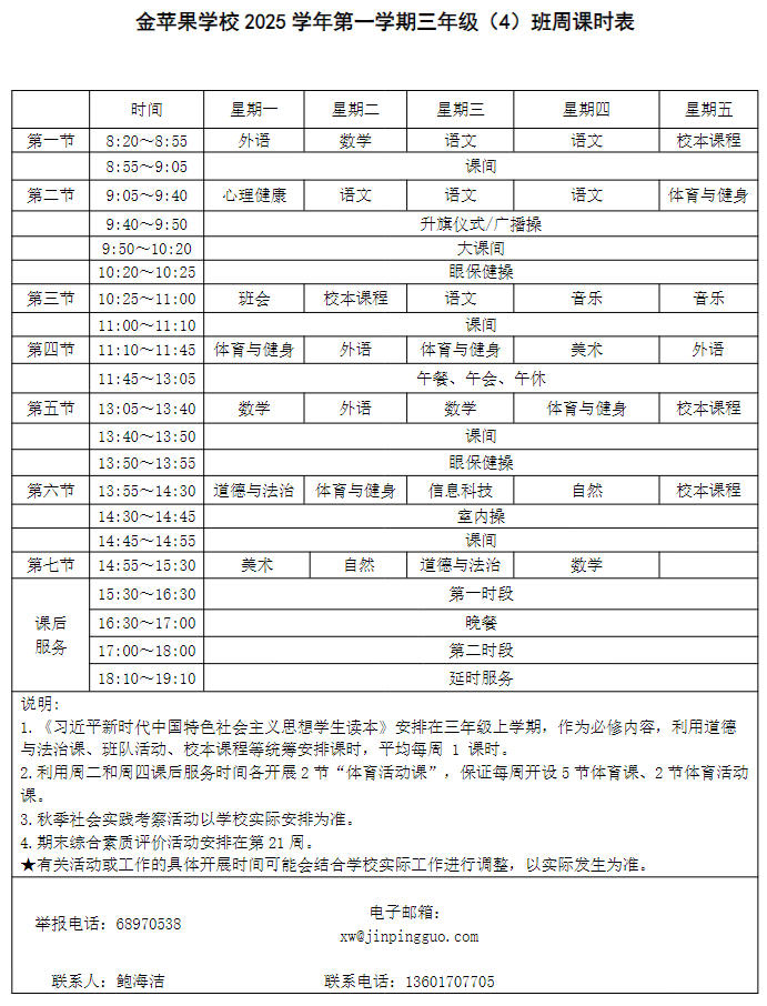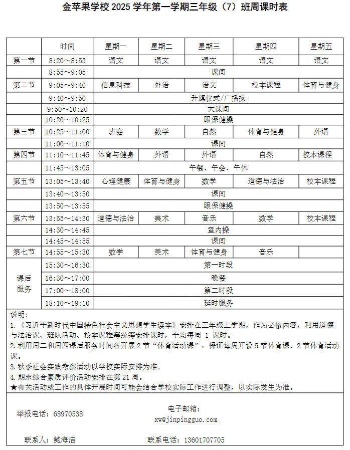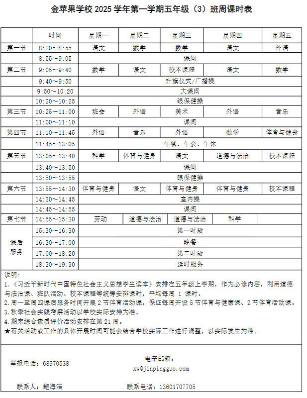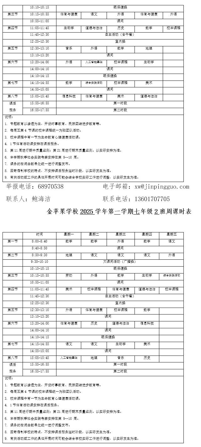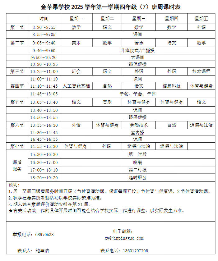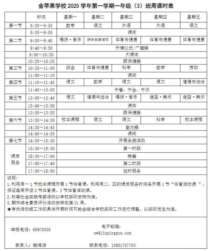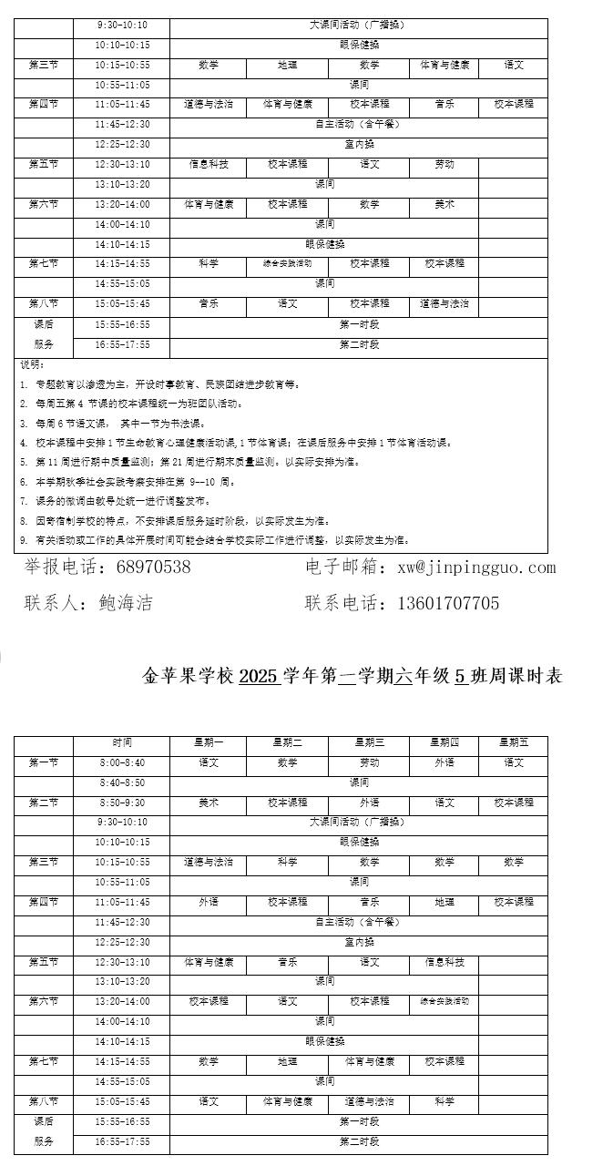 为深入贯彻落实中办、国办《关于全面加强和改进新时代学校体育工作的意见》、《关于全面加强和改进新时代学校美育工作的意见》和市教育局关于“晒课表”相关文件精神,严格落实学校体育、美育、劳动教育课程开设刚性要求,按照国家课程方案和课程标准开齐开足上好体育美育劳动教育课,开展好课后体育美育劳动教育活动,使学生掌握更多的运动技能,拥有更多的艺术特长,收获更多的劳动体验。现将我校所有年级课程表进行公布,自觉接受家长和社会监督,落实“增效减负提质”的要求。