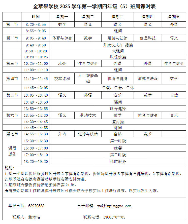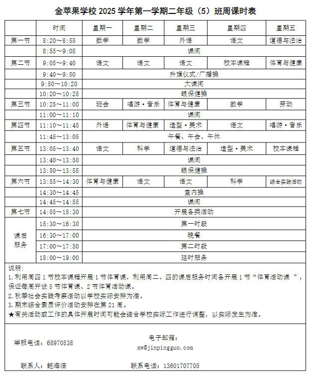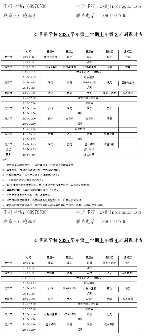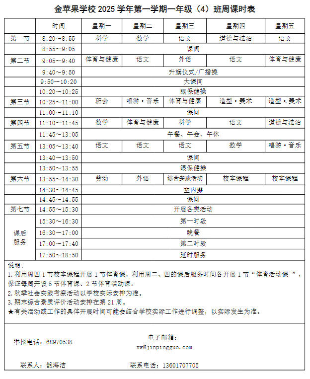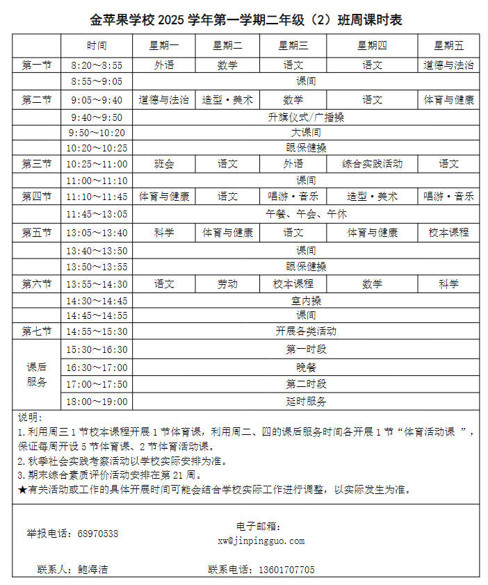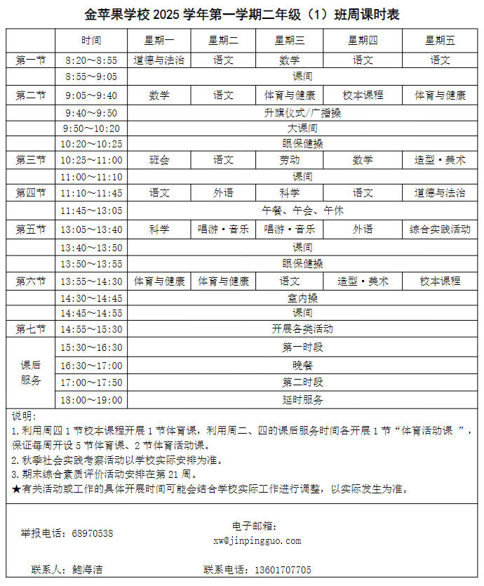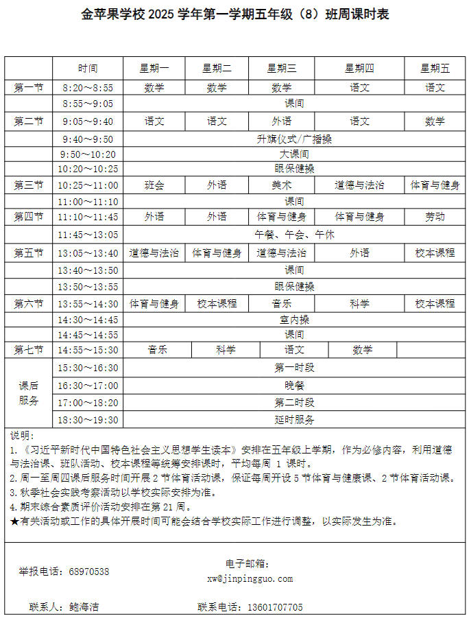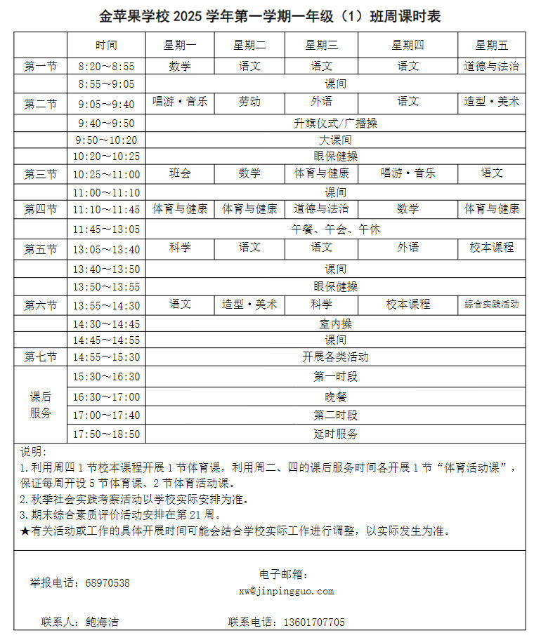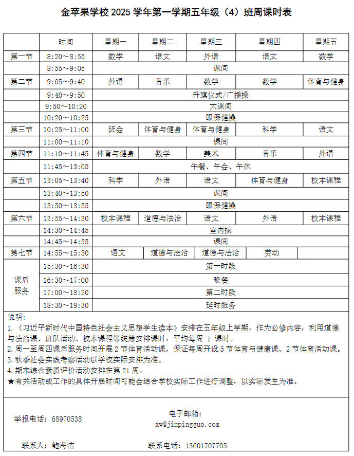 为深入贯彻落实中办、国办《关于全面加强和改进新时代学校体育工作的意见》、《关于全面加强和改进新时代学校美育工作的意见》和市教育局关于“晒课表”相关文件精神,严格落实学校体育、美育、劳动教育课程开设刚性要求,按照国家课程方案和课程标准开齐开足上好体育美育劳动教育课,开展好课后体育美育劳动教育活动,使学生掌握更多的运动技能,拥有更多的艺术特长,收获更多的劳动体验。现将我校所有年级课程表进行公布,自觉接受家长和社会监督,落实“增效减负提质”的要求。