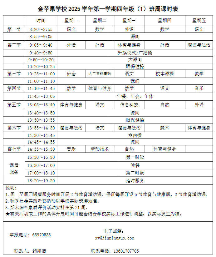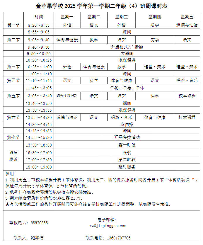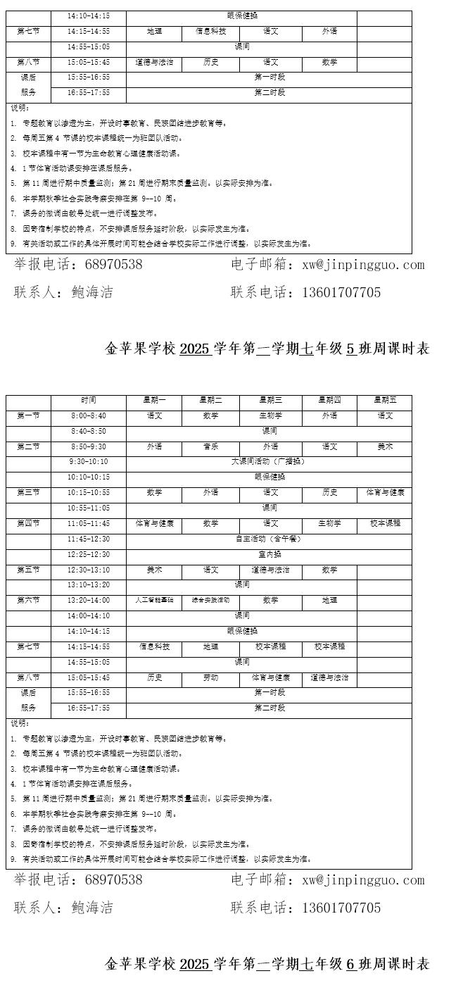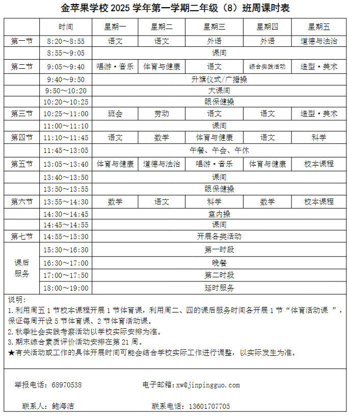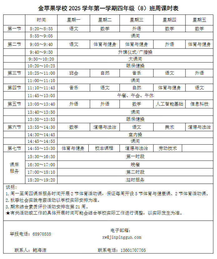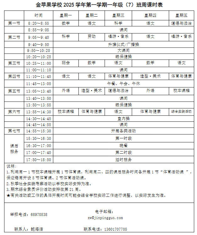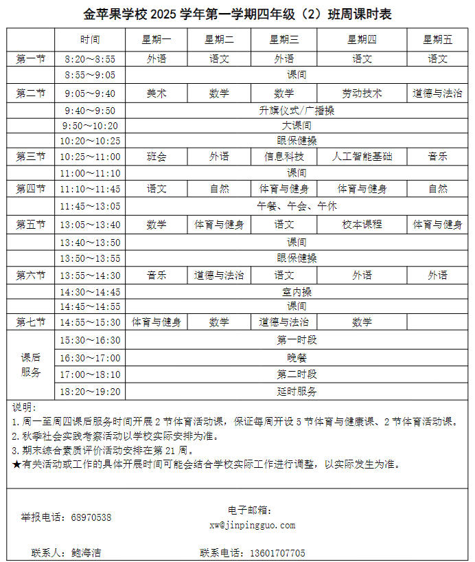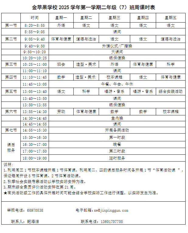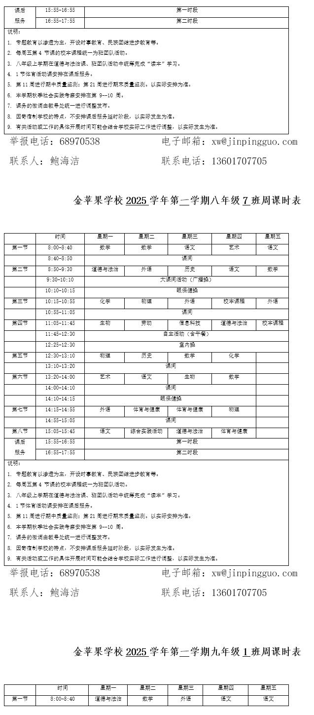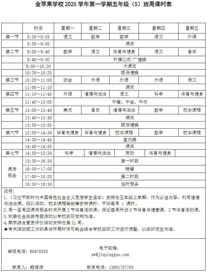 为深入贯彻落实中办、国办《关于全面加强和改进新时代学校体育工作的意见》、《关于全面加强和改进新时代学校美育工作的意见》和市教育局关于“晒课表”相关文件精神,严格落实学校体育、美育、劳动教育课程开设刚性要求,按照国家课程方案和课程标准开齐开足上好体育美育劳动教育课,开展好课后体育美育劳动教育活动,使学生掌握更多的运动技能,拥有更多的艺术特长,收获更多的劳动体验。现将我校所有年级课程表进行公布,自觉接受家长和社会监督,落实“增效减负提质”的要求。