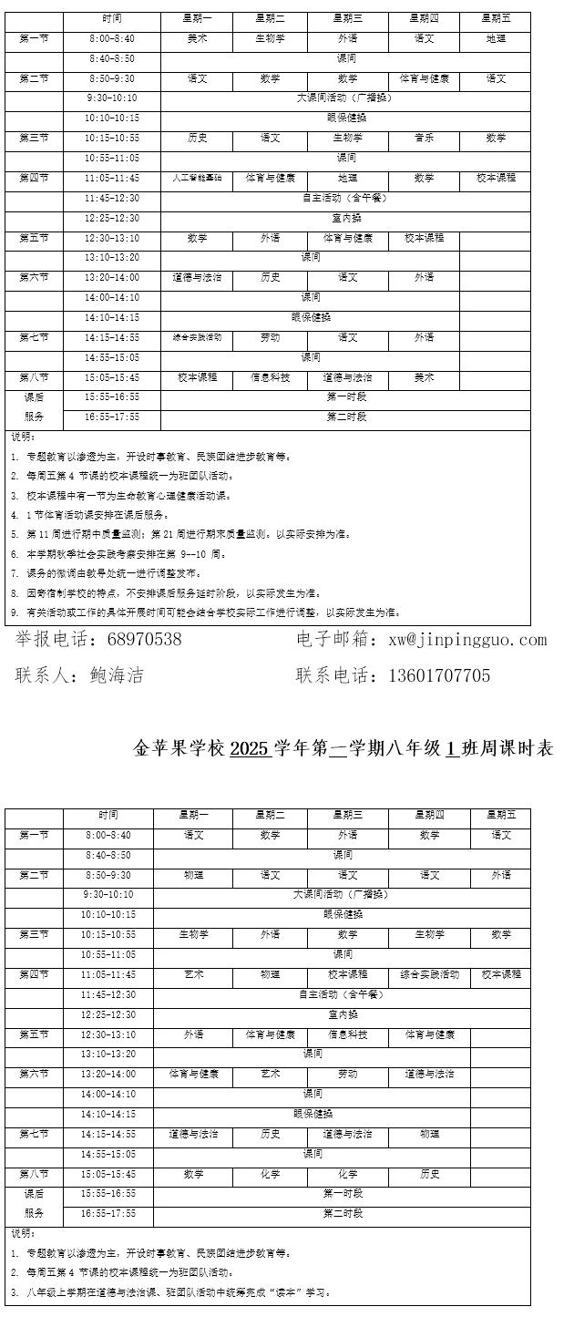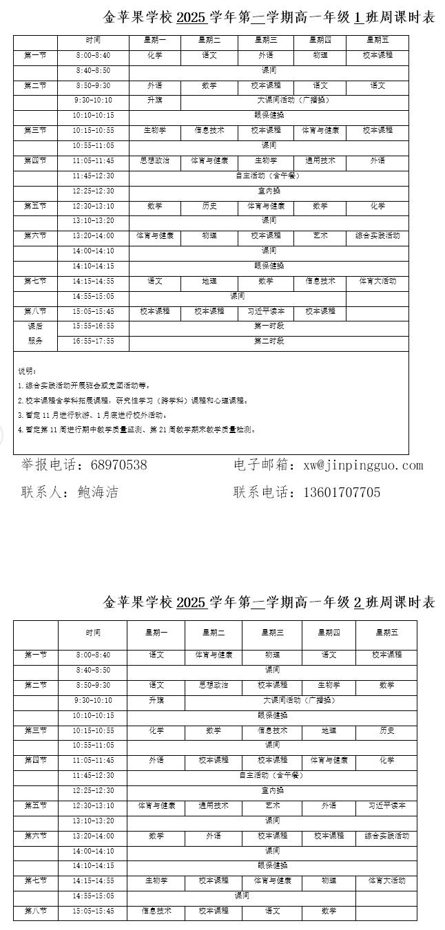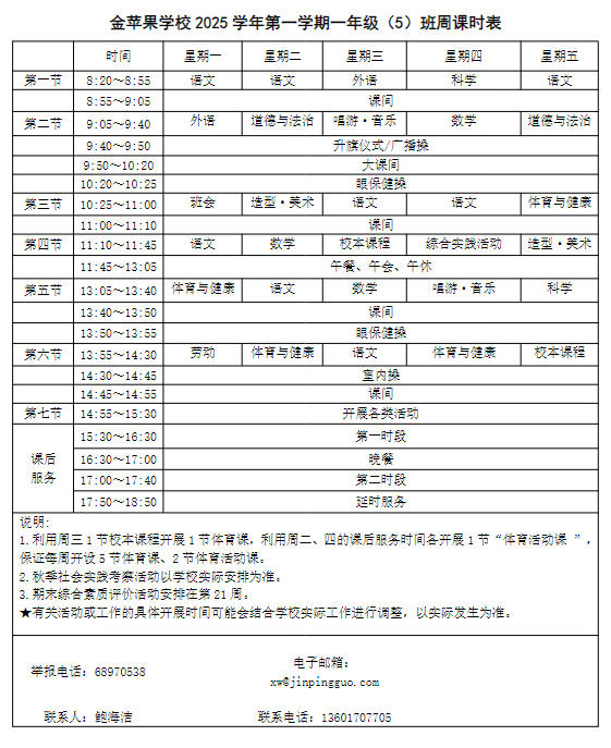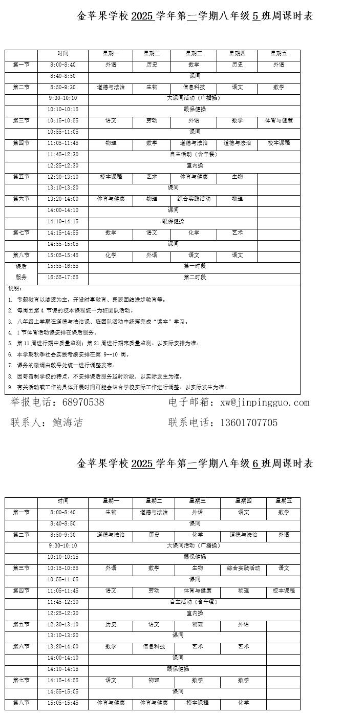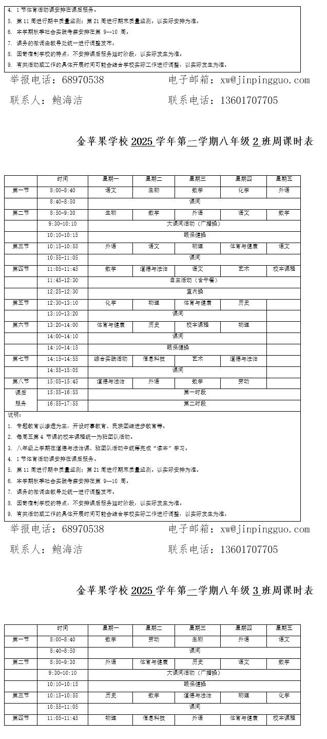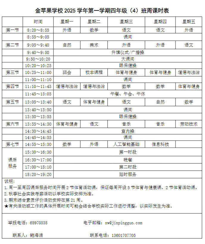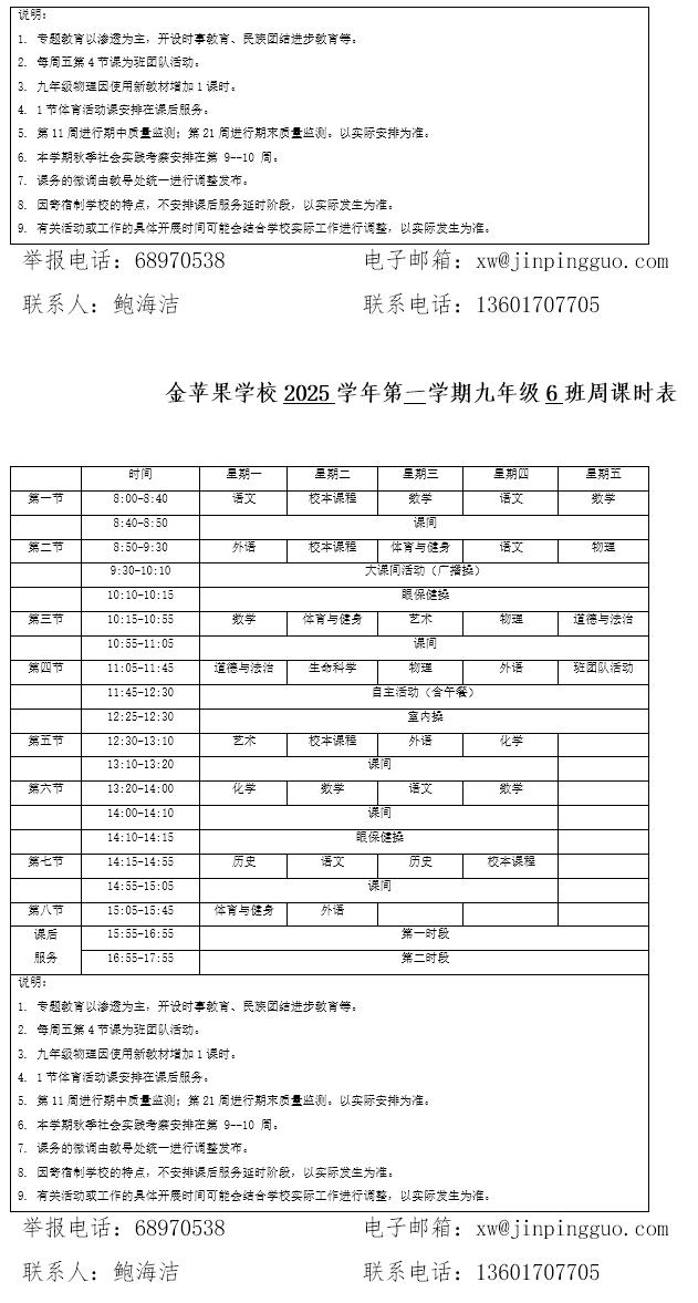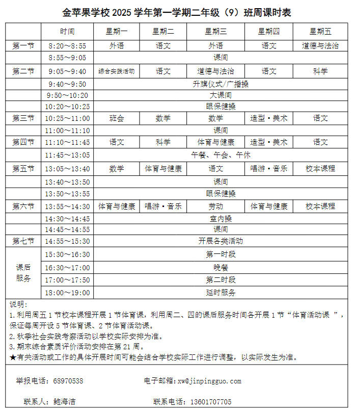 为深入贯彻落实中办、国办《关于全面加强和改进新时代学校体育工作的意见》、《关于全面加强和改进新时代学校美育工作的意见》和市教育局关于“晒课表”相关文件精神,严格落实学校体育、美育、劳动教育课程开设刚性要求,按照国家课程方案和课程标准开齐开足上好体育美育劳动教育课,开展好课后体育美育劳动教育活动,使学生掌握更多的运动技能,拥有更多的艺术特长,收获更多的劳动体验。现将我校所有年级课程表进行公布,自觉接受家长和社会监督,落实“增效减负提质”的要求。