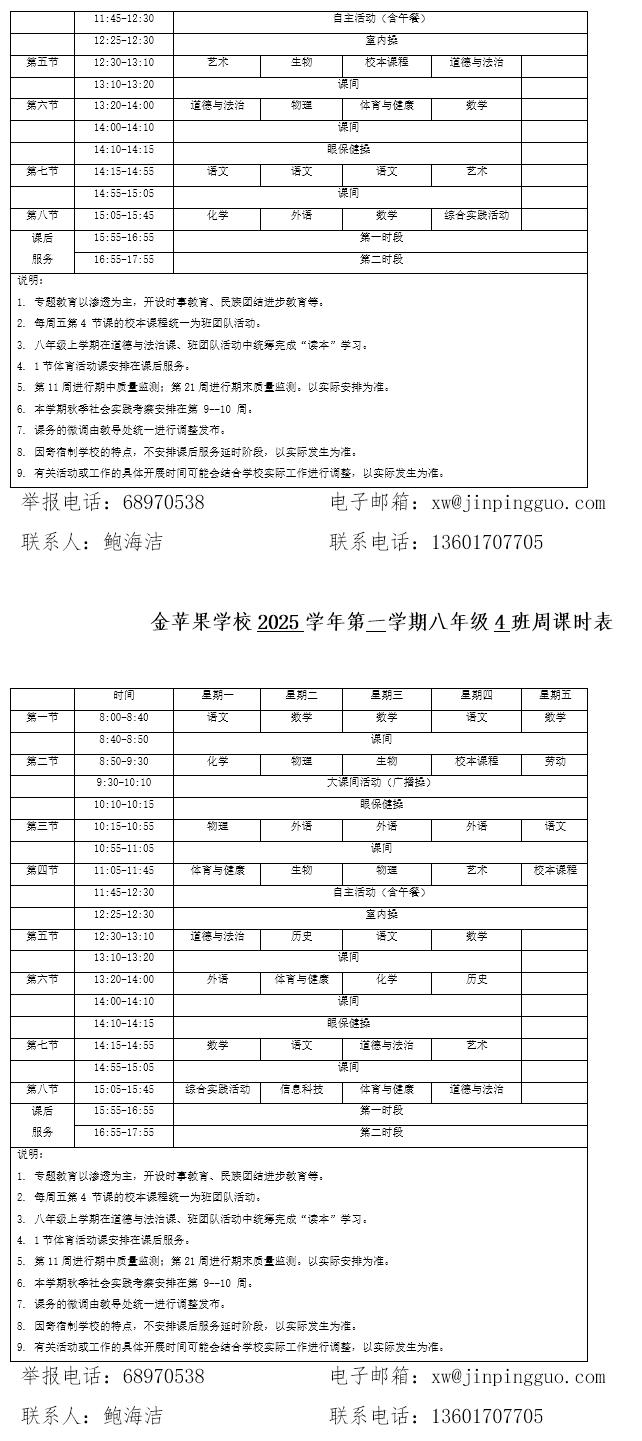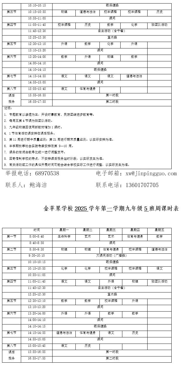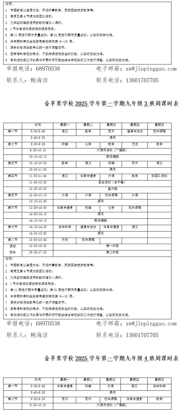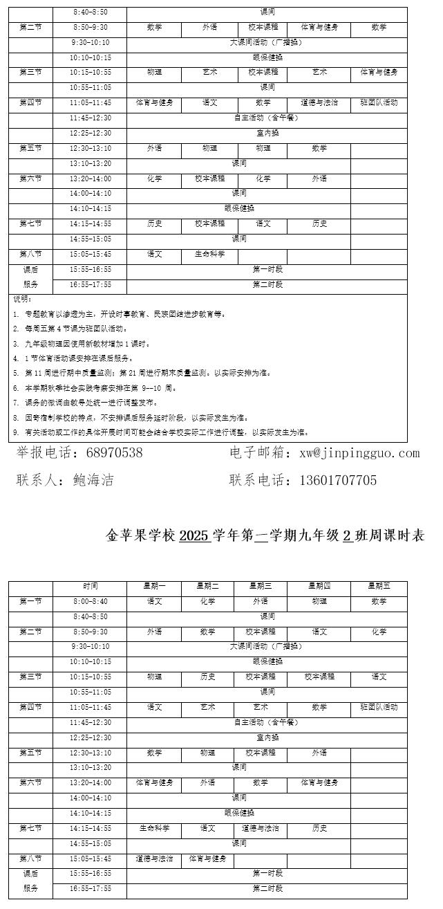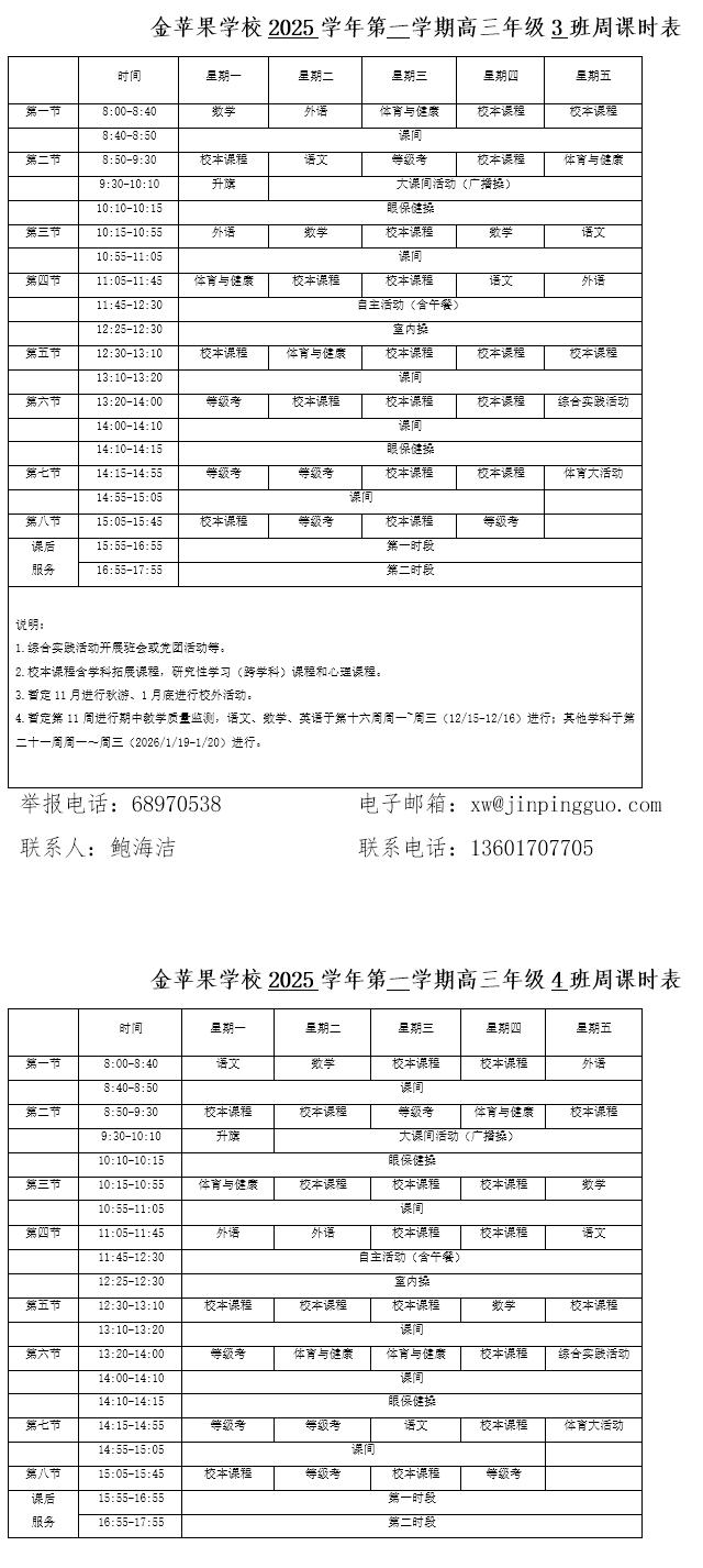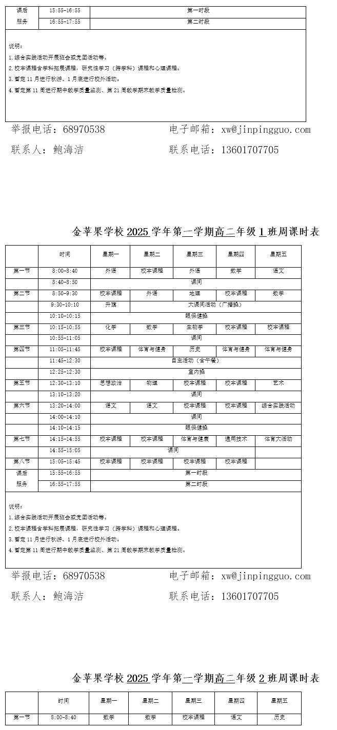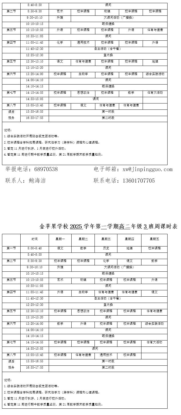 为深入贯彻落实中办、国办《关于全面加强和改进新时代学校体育工作的意见》、《关于全面加强和改进新时代学校美育工作的意见》和市教育局关于“晒课表”相关文件精神,严格落实学校体育、美育、劳动教育课程开设刚性要求,按照国家课程方案和课程标准开齐开足上好体育美育劳动教育课,开展好课后体育美育劳动教育活动,使学生掌握更多的运动技能,拥有更多的艺术特长,收获更多的劳动体验。现将我校所有年级课程表进行公布,自觉接受家长和社会监督,落实“增效减负提质”的要求。