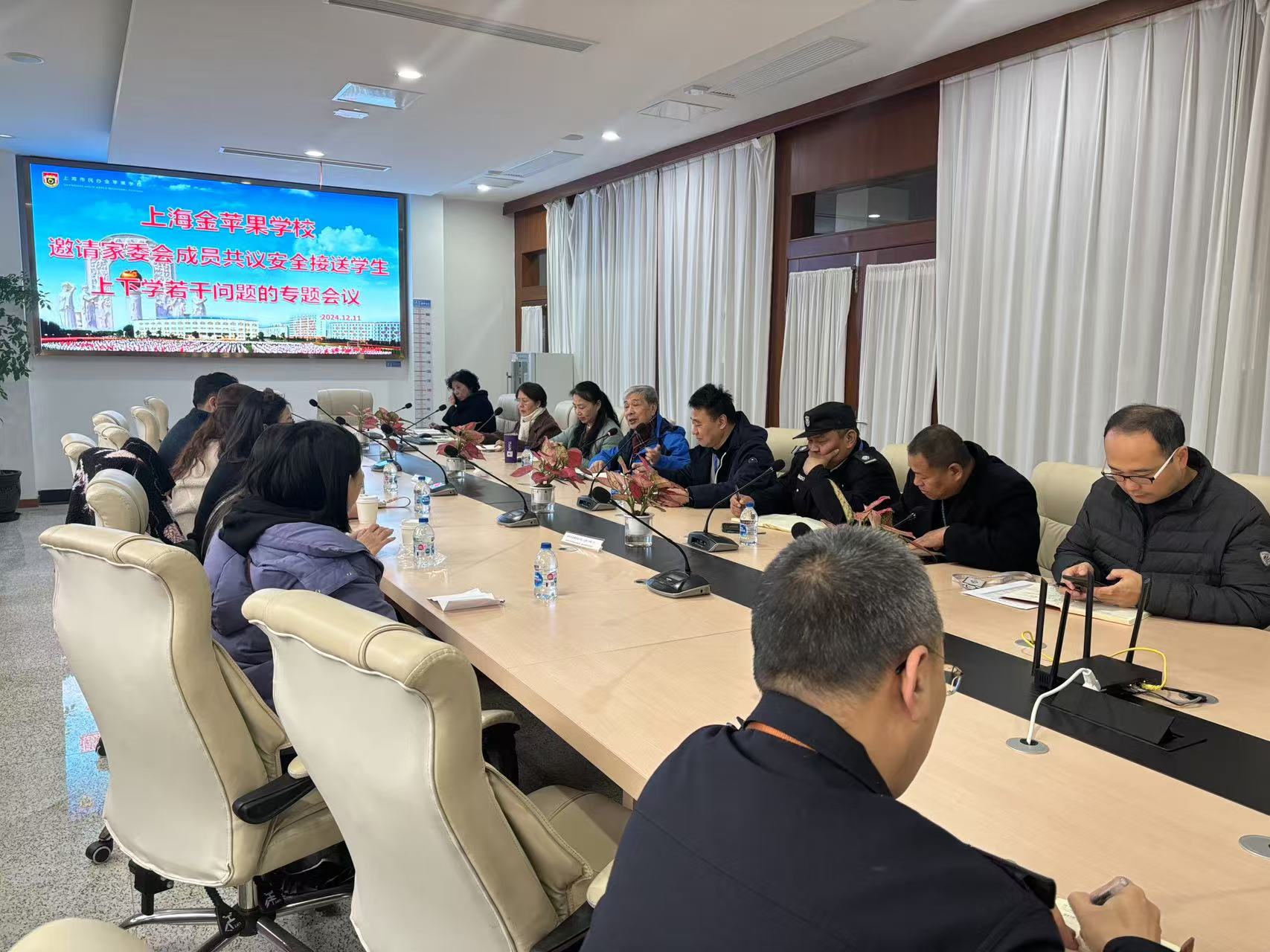2024年12月11日上午9:00在行政楼第二会议室 —— 召开了主题为“上海金苹果学校邀请家委会成员共议安全接送学生上下学若干问题的专题会议”,进一步与家长代表共同优化校园周边交通环境,确保学生上下学期间的道路安全协工作,本次会议由总校长周一飞和党支部书记朱军共同主持,联合小学部、中学部家委会会长、浦东交警支队三大队、高行派出所、学校学部、督导、后勤总务处、电教中心等部门领导共同参加。共同探讨家长在接送孩子时,遇到的难点和困难,并结合交警给出的建议,缓解高峰期间交通拥堵、乱停车等问题。
